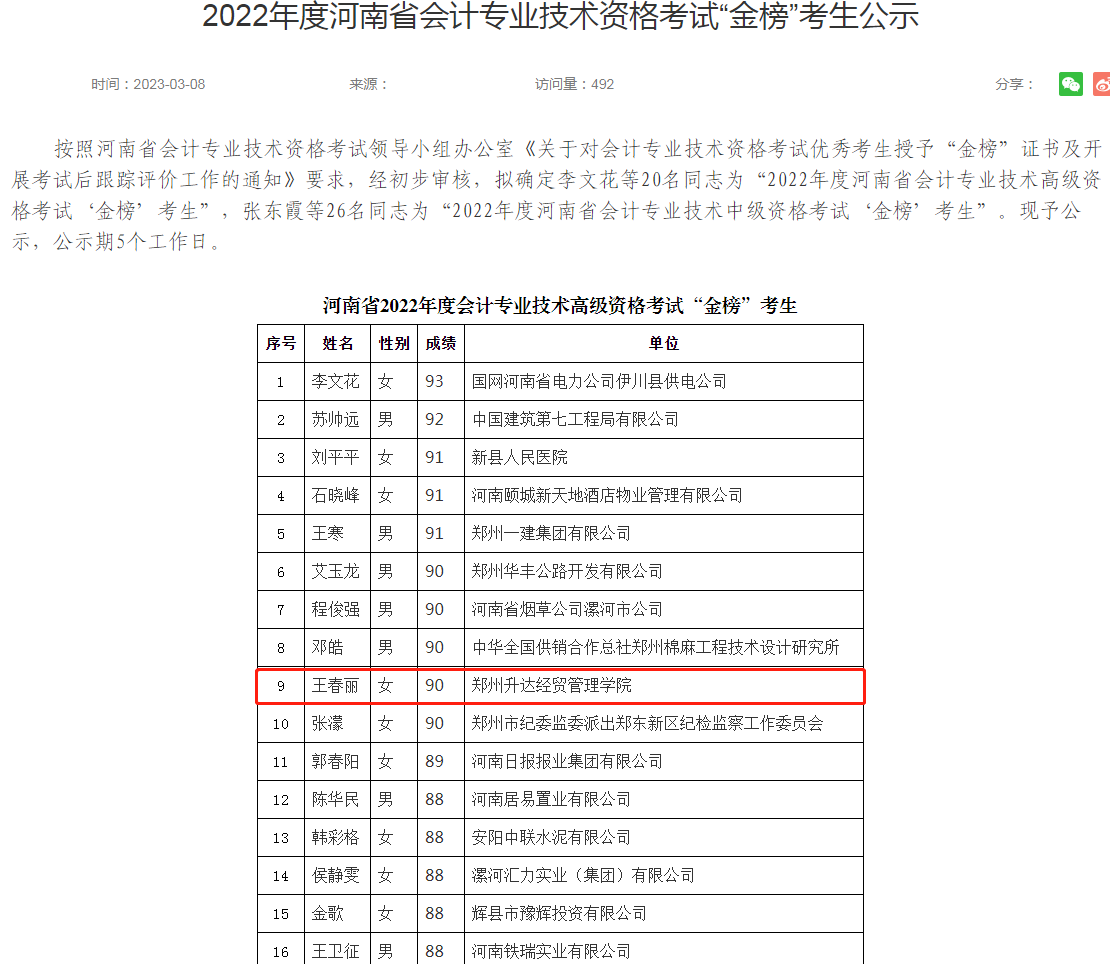 根据全省会计专业技术资格考试成绩排名,经走访考察、资格审查、网上公示、培训培养,财务处王春丽同仁被授予 “2022年度河南省会计专业技术高级资格考试‘金榜’考生”(全省共20名),同时也荣获“河南省2022年度全国会计专业技术高级资格考试‘银榜’考生”称号。