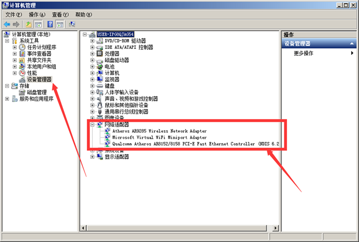 “设备管理器”选项,再观察“网络适配器”是否有问题,如果有问题很明显就不一样,会在设备上面出现“黄色感叹号”。出现这种问题可在别的电脑上下载对用驱动,然后从新安装一下。