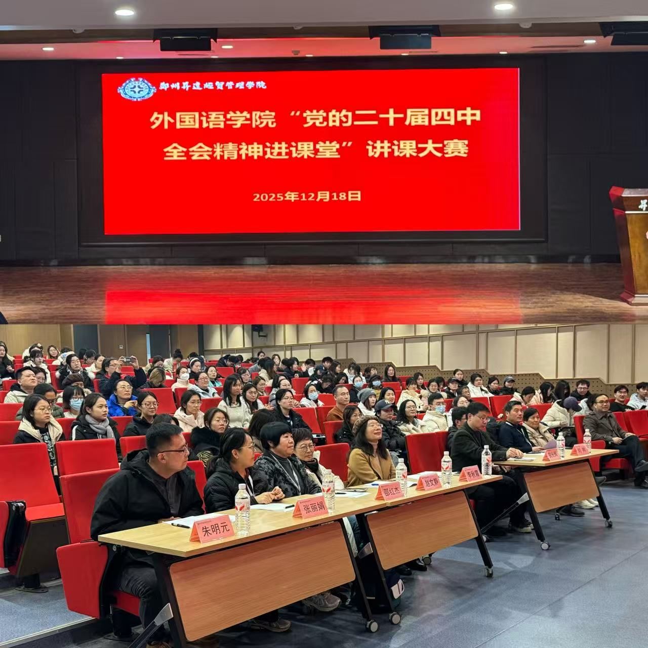 为深入学习贯彻党的二十届四中全会精神,推动党的创新理论与教育教学深度融合,充分发挥课堂教学育人主渠道作用,由外国语学院党委主办,经过为期一个月的全员参与选拔和初赛,12月18日,外国语学院“党的二十届四中全会精神进课堂”讲课大赛决赛如期举行。外国语学院院长王莉莉、院党委书记石皓召出席决赛。党委办公室副主任、马克思主义学院党委副书记刘帅、外国语学院副院长贺光辉、校督导李秋霞、外国语学院赵文静教授、邵红杰教授、张丽娟老师、朱明元老师担任本次决赛评委。