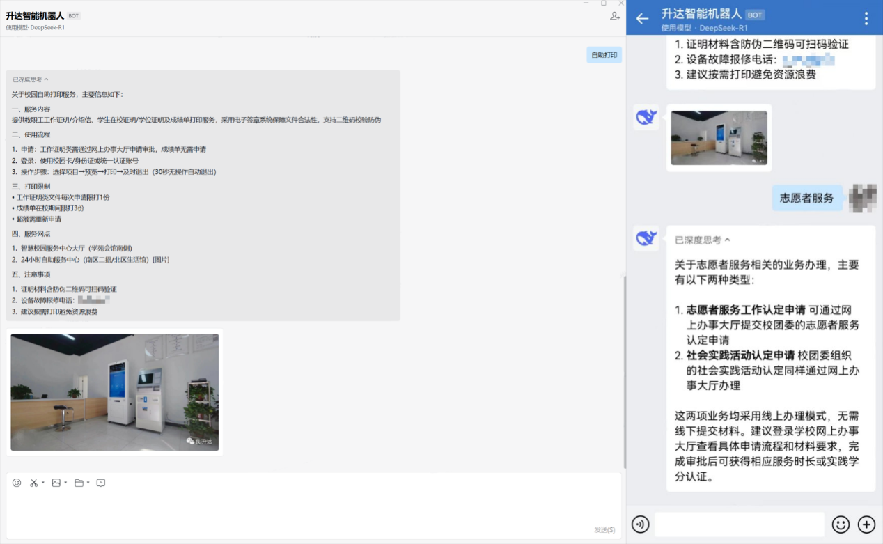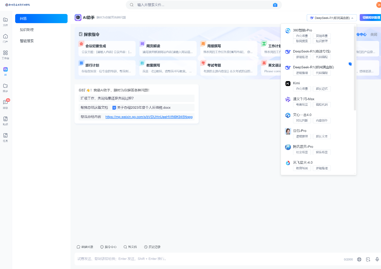 In response to the national education digital transformation strategy, our university actively promotes the integration of DeepSeek, which has been officially launched. At the same time, as a member of the CARSI Alliance, our university has accessed Zhejiang University's full-blooded version of DeepSeek to share its resource services. The mobile end provides consulting services to teachers and students through "intelligent robots" based on Enterprise WeChat, accompanying teachers and students in school life and answering various questions as virtual humans. Mainstream artificial intelligence models, such as DeepSeek, 360 Smart Brain, Kimi, Doubao, Wenxin Yiyan, and Tongyi Qianwen, are more targeted and empowerment learning and office scenarios. Through the deep application of AI technology, the school has built an efficient and intelligent education and teaching ecosystem, injecting new impetus into the construction of a smart campus. In the future, we will gradually promote the intelligent upgrade of teaching, scientific research, management, and other scenarios with the powerful capabilities of the DeepSeek model.