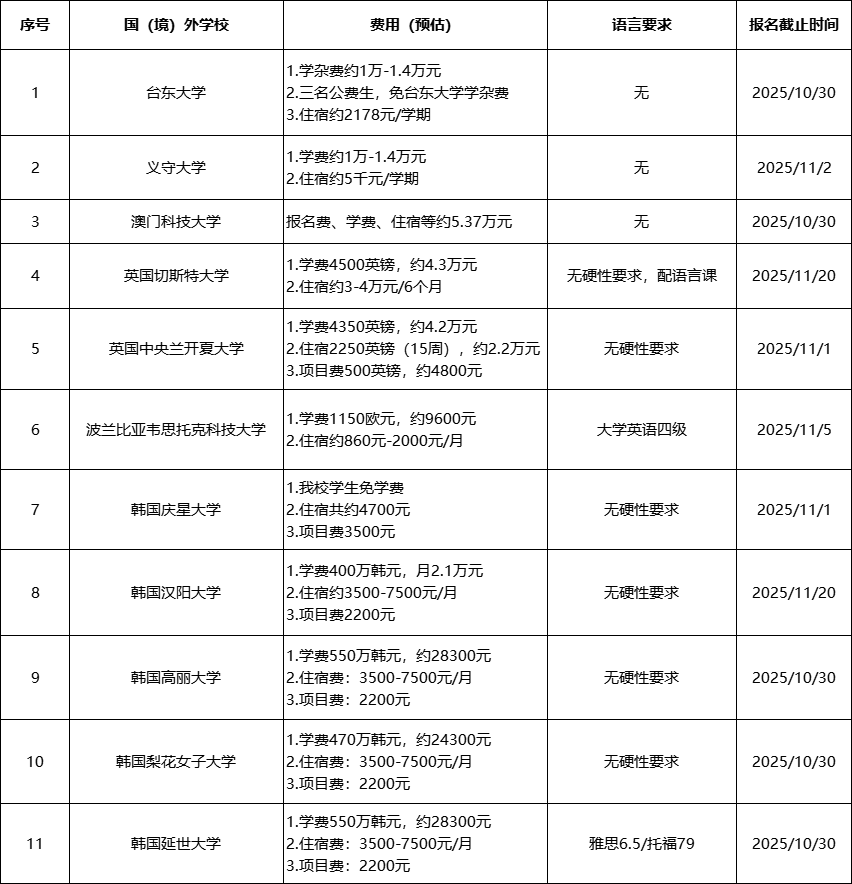 为促进我校与国(境)外高校学生间的学术交流与学习,提高学生的综合素质,激发学生创新学习的动力,我校每学期选派学生至国(境)外合作院校进行交流学习。现将2026年春第一批赴国(境)外交换生项目报名具体情况通知如下,第二批另行通知。