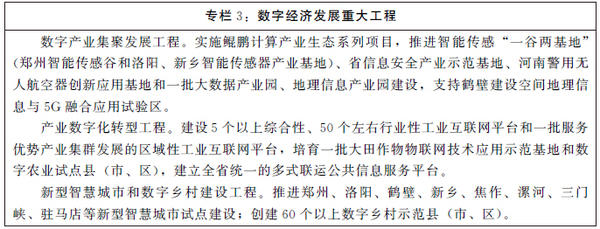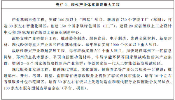 ——制造业高质量发展行动。实施产业基础再造和产业链现代化提升工程、战略性新兴产业跨越发展工程,拓展数字赋能和智能制造覆盖面,开展先进制造业和现代服务业融合试点,完善高能级产业载体体系,争创国家制造业高质量发展试验区,建设先进制造业强省、现代服务业强省、质量强省和数字河南。