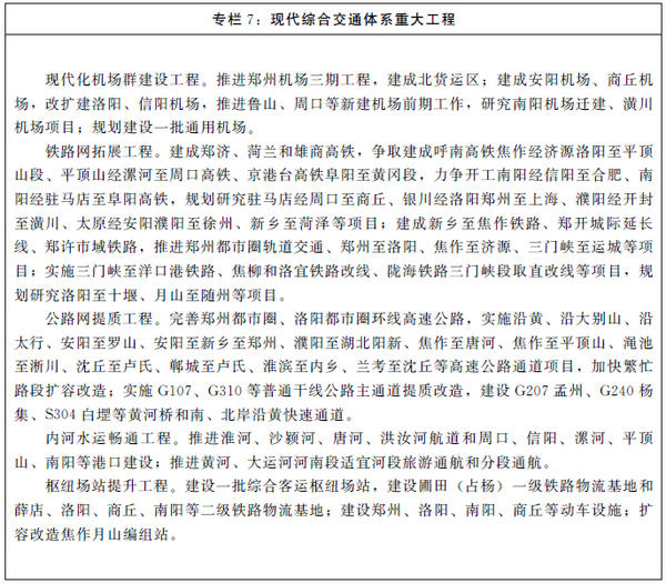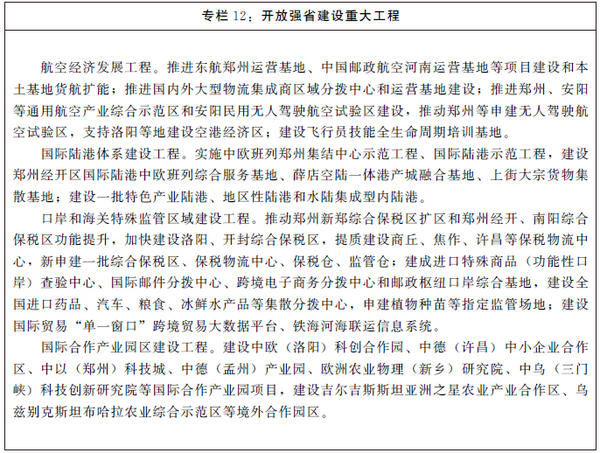 ——高能级开放平台提质行动。以高水平融入共建“一带一路”为牵引,放大郑州航空港经济综合实验区产业、枢纽、通道、都市集成效应,高水平建设“四条丝绸之路”,加强自贸试验区制度创新和复制推广,推动设立自贸试验区航空港扩展区域,完善开发区、口岸等开放平台功能,做大做强枢纽经济、航空经济、口岸经济、临港经济,打造贸易强省。