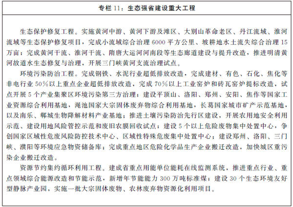 ——大河大山大平原保护治理实现更大进展。生态强省加快建设,生态环境持续改善,国土空间开发保护格局得到优化,生产生活方式绿色转型成效显著。能源资源配置更加合理、利用效率大幅提高,煤炭占能源消费总量比重降低5个百分点左右。主要污染物排放总量持续减少,重污染天气基本消除,劣V类水体和县级以上城市建成区黑臭水体基本消除。流域水系生态廊道、山地生态屏障、农田和城市生态系统加快形成,生态保护修复走在黄河流域前列,森林河南基本建成。