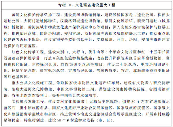 ——黄河文化保护传承弘扬行动。加快推进重大遗址保护和黄河历史文化地标城市建设,推进黄河文化专题博物馆建设,打造黄河国家文化公园重点建设区,构建以郑汴洛为引领、省内全流域贯通的黄河历史文化旅游带。