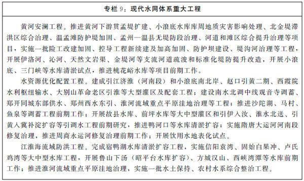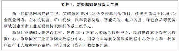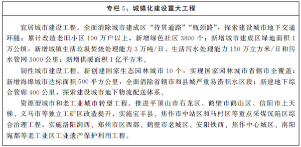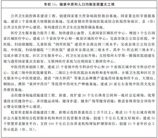 ——基础能力和民生补短板行动。加快5G网络、大数据中心、高铁网、高速公路“13445工程”、外电外气入豫通道、现代水网、城镇老旧小区改造等“两新一重”项目建设,打造交通强省、网络强省;持续办好就业、教育、医疗、养老、托幼等民生实事,推进社会工作服务站乡镇(街道)全覆盖,完善公共卫生防控体系、公共安全体系和城市综合防护体系,夯实社会治理基层基础。