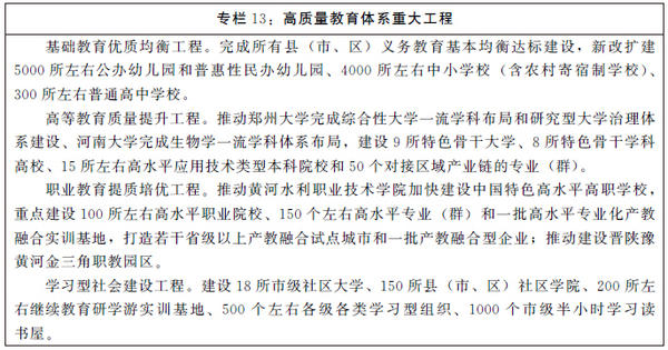 完善终身学习体系,加快全民终身教育学分银行建设,推动各级各类学历教育、非学历教育衔接融通和成果认定转换,满足全民人生各阶段的个性化学习与多途径成才需要。健全继续教育管理体制和质量保障机制,办好开放大学,大力发展各类学习型组织。提升发展“互联网+教育”,建设一批面向社会共享开放的优质网络课程。推进全民阅读,支持实体书店发展,试点推广城市书屋、文化驿站等项目,加快建设书香中原。