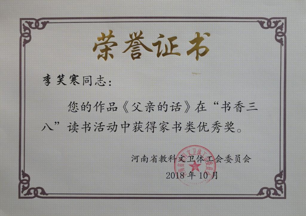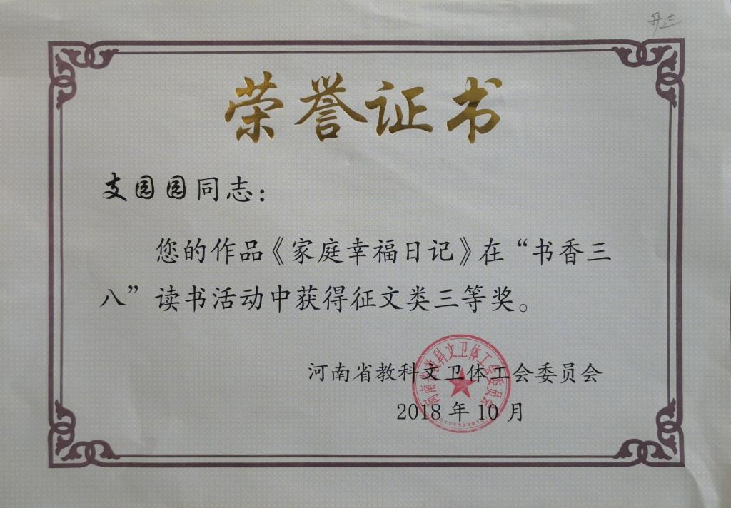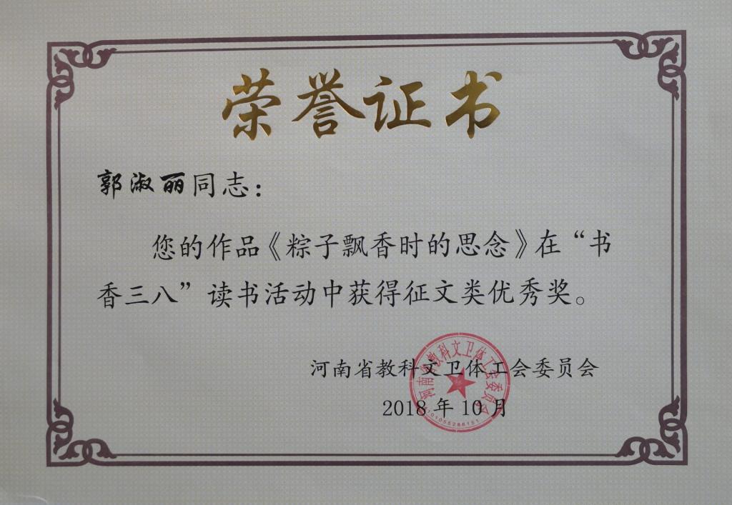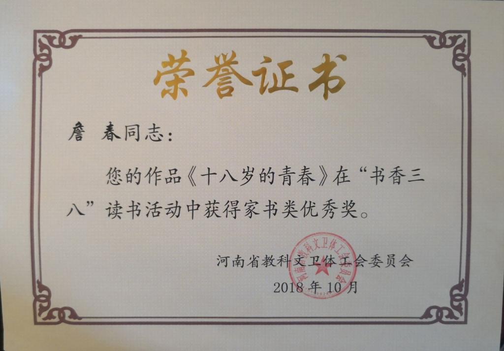 近日,河南省教科文卫体工会下发《关于表彰“书香三八”读书活动获奖个人的决定》(豫教科文卫体工〔2018〕20号),对全省高校获奖者予以表彰。我校教师支园园的作品《家庭幸福日记》荣获征文类三等奖,教师郭淑丽的作品《粽子飘香时的思念》荣获征文类优秀奖;教师詹春的作品《十八岁的青春》、教师李笑寒的作品《父亲的话》荣获家书类优秀奖。