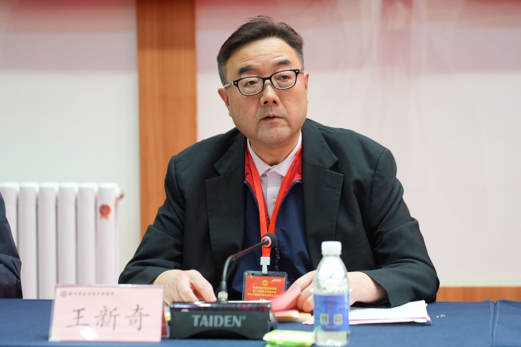 王新奇致辞,他代表学校董事会,向大会的胜利召开表示最热烈的祝贺!他提出三点希望:一是希望大家坚守初心,强化使命担当;二是希望大家聚焦重点,积极建言献策;三是希望大家团结协作,凝聚发展合力。他表示学校董事会将不断地改善教职工的工作、生活、住宿环境,提高福利待遇,为大家营造良好的工作生活氛围。他坚信在全体教职工的共同努力下,全校上下一定能够攻坚克难、抢抓机遇,不断开创学校高质量发展的新局面,为学校的高质量发展而努力奋斗!