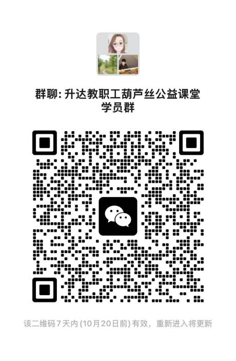 扫描下方报名群二维码,加入 “升达教职工葫芦丝公益课堂学员群”,入群后修改群昵称格式为 “部门 + 姓名”;
