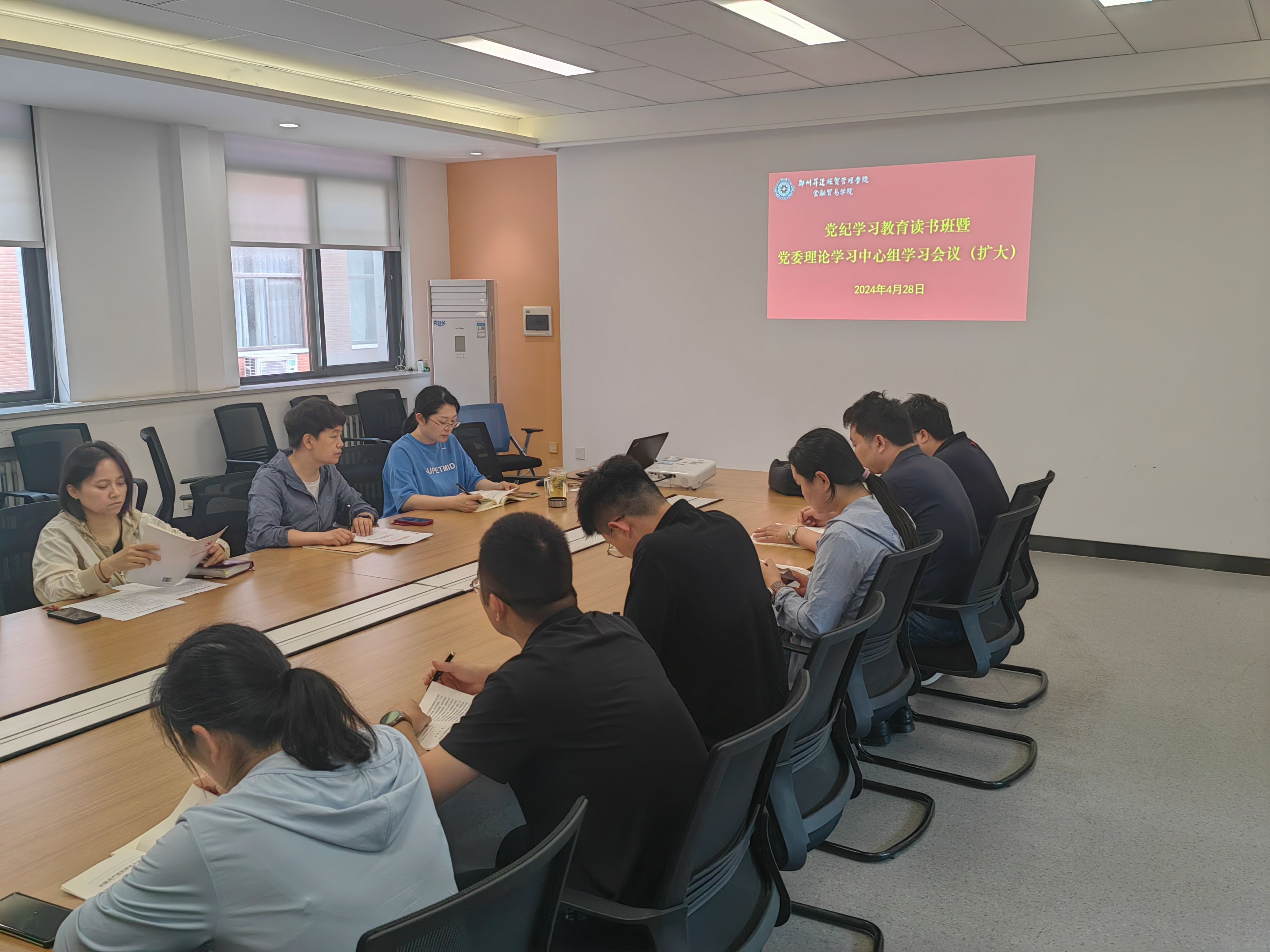 为深入贯彻落实习近平总书记关于加强党的纪律建设的重要论述,4月28日上午,金融贸易学院在3号楼212会议室组织召开党纪学习教育读书班暨党委理论学习中心组学习会议(扩大)。会议由金融贸易学院党委书记钟江鸽主持,党委理论学习中心组全体成员、各党支部书记参加。
