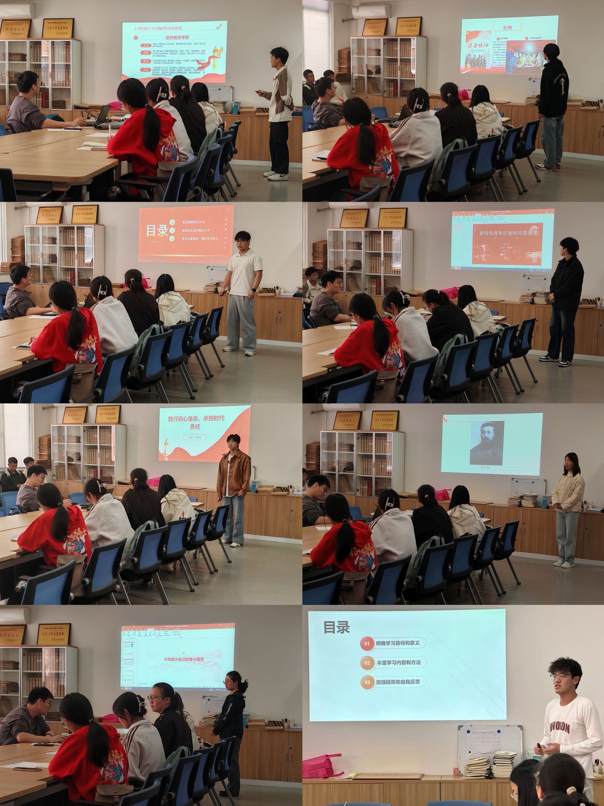 本次学习成果汇报会主要围绕党课内容展开,各学习小组通过PPT展示了自己的党课学习成果。汇报人分别从“如何增强党员意识发挥党员作用”、“新时代青年应如何全力兴党强党”、“如何正确履行入党流程”、“如何牢记义务权利、强化党员意识”、“如何继承和发扬党的优良传统和作风”等主题进行汇报展示。