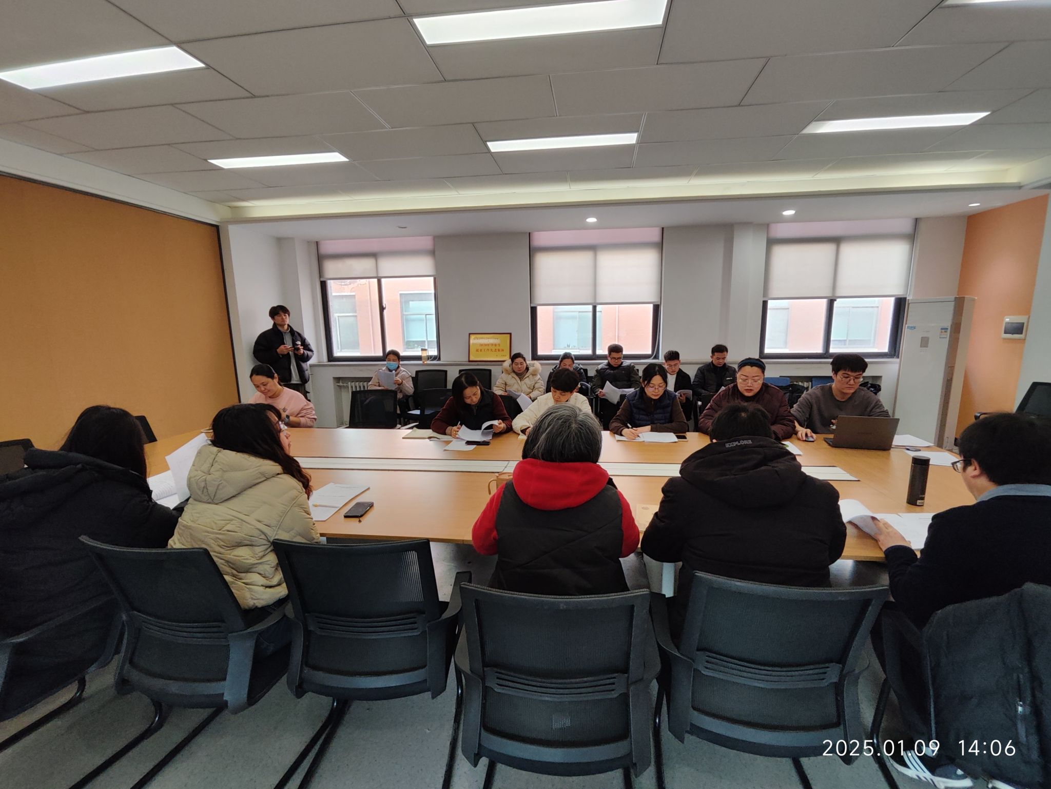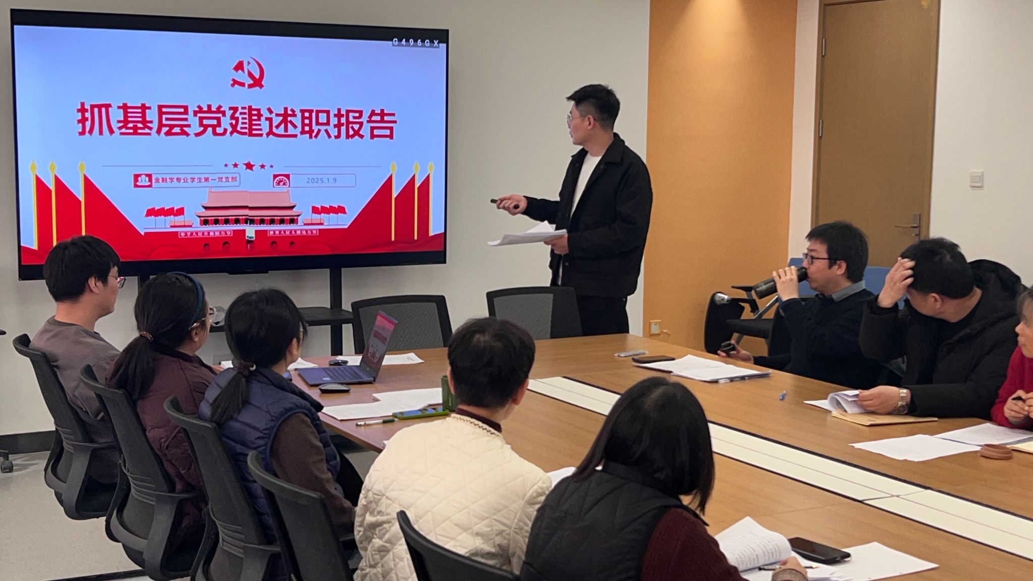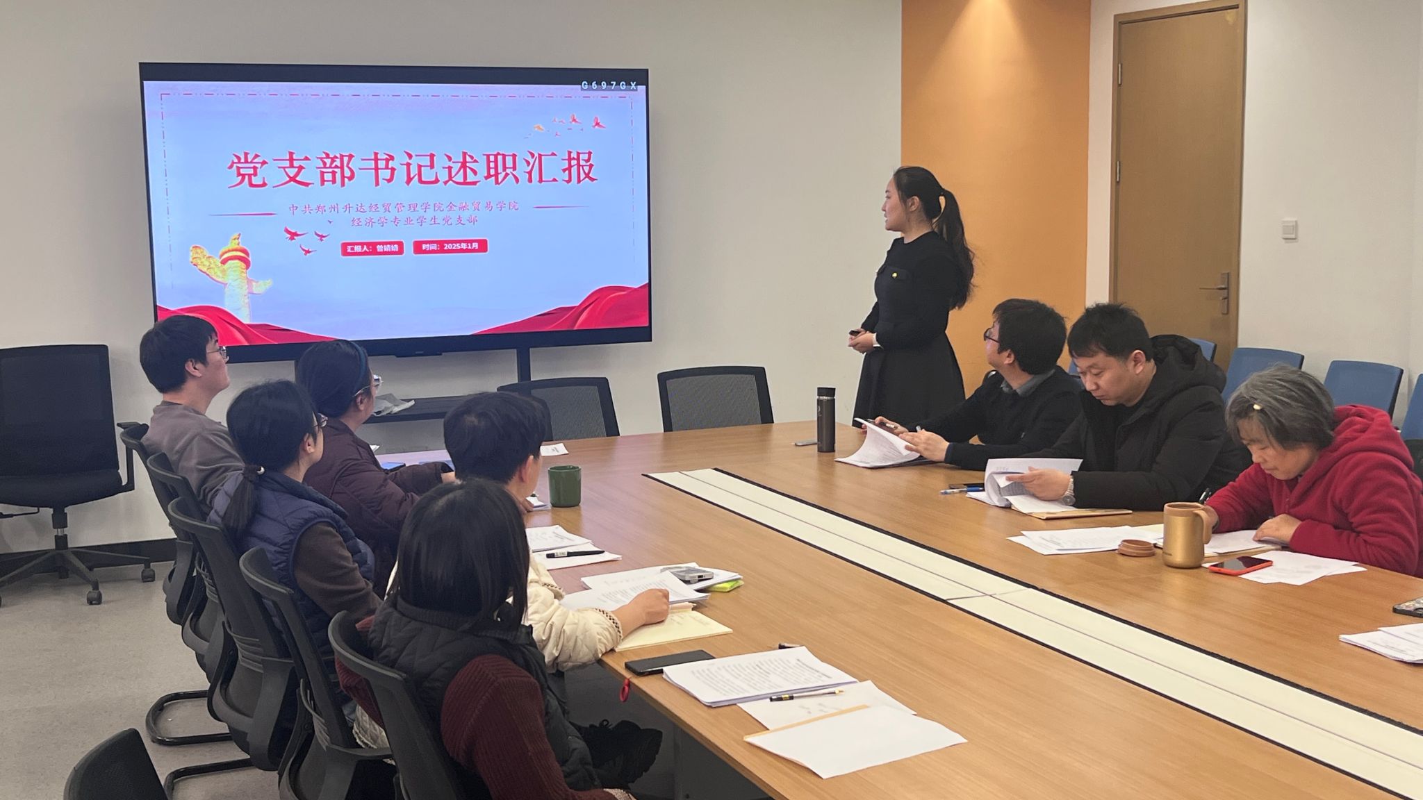 2025年1月9日,金融贸易学院在三号楼212会议室召开2024年抓基层党建工作述职评议会,会议由党委委员王娟主持,院党委书记钟江鸽、院党委委员、各党支部书记、师生党员代表参加。