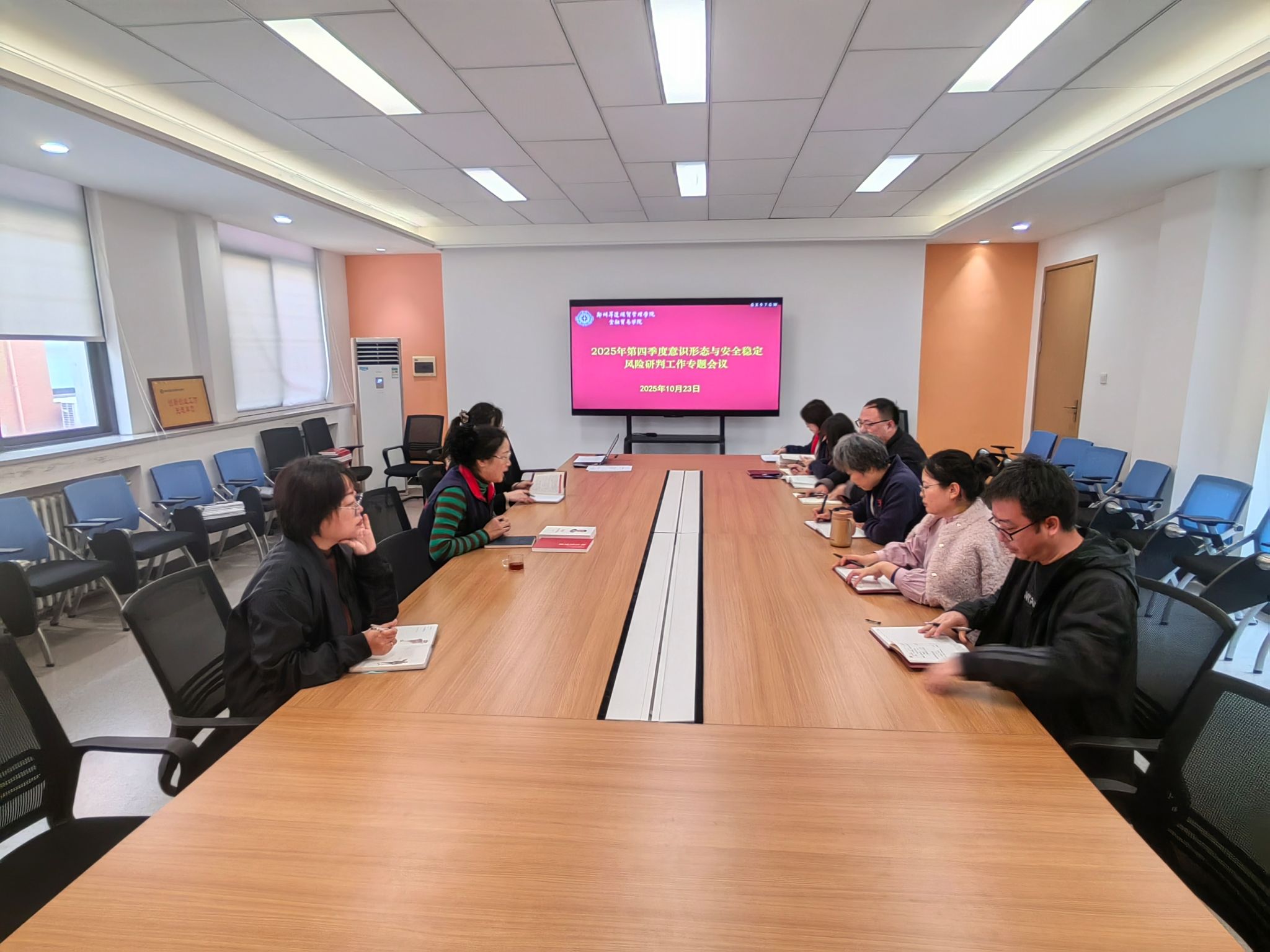10月23日,金融贸易学院在教学3号楼212室组织召开2025年第四季度意识形态与安全稳定风险研判工作专题会议。会议由学院党委书记张小雁主持,党委委员和党支部书记参加。会议总结前三季度工作成效,分析研判意识形态领域形势,安排部署第四季度工作任务。