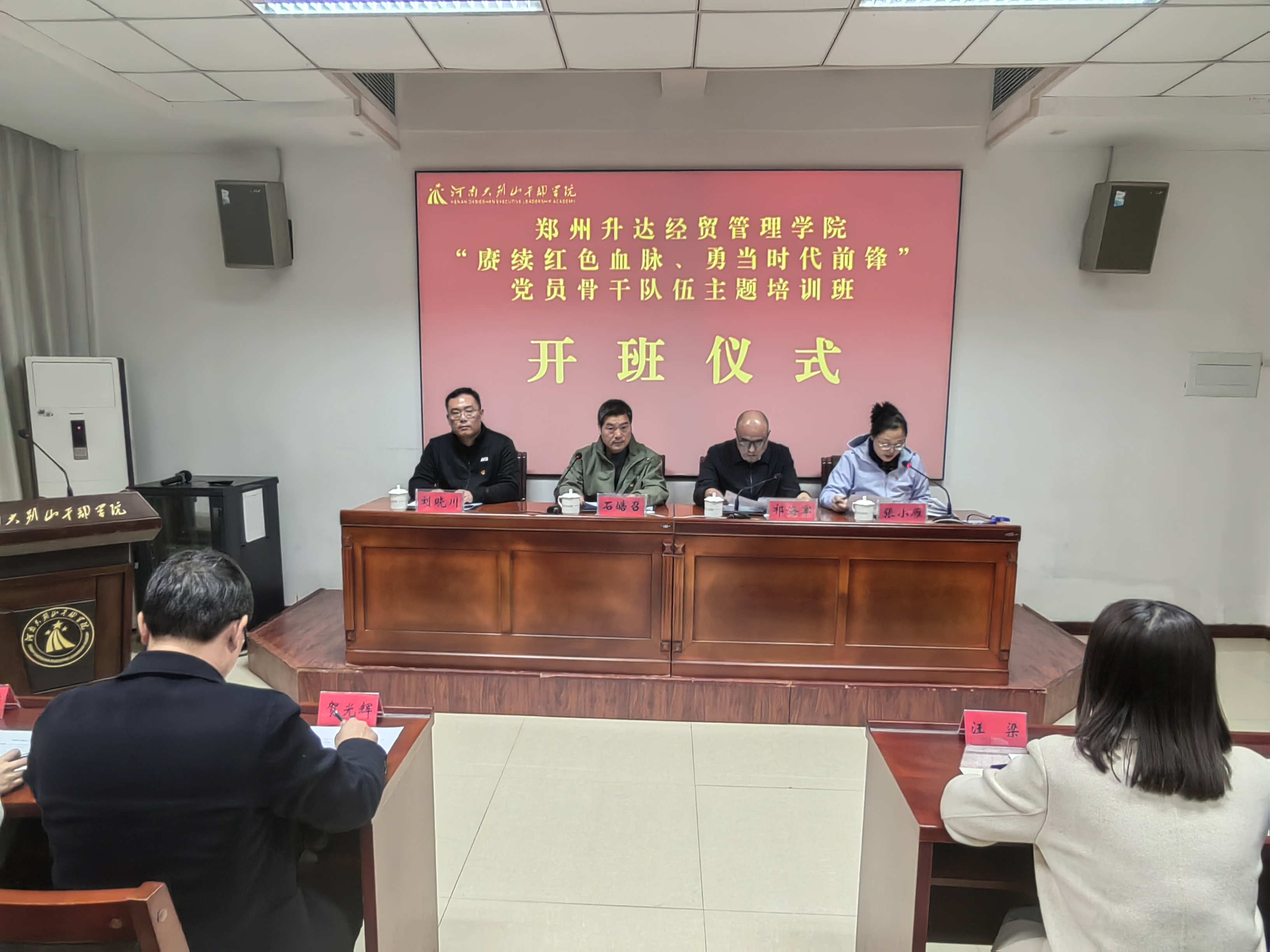 21日晚,开班仪式在河南大别山干部学院隆重举行。河南大别山干部学院党委委员、副院长祁海军,外国语学院党委书记石皓召、文法学院党委书记刘晓川及全体参训学员出席仪式。仪式由金融贸易学院党委书记张小雁主持。开班仪式在庄严的国歌声中启动。河南大别山干部学院党委委员、副院长祁海军致欢迎辞,对远道而来的学员表示热烈欢迎。他深情回顾了大别山革命老区“二十八年红旗不倒”的光辉历程。祁海军表示,学院将充分发挥师资优势,精细做好服务保障,助力学员在学思践悟中提升能力,确保培训取得扎实成效。外国语学院党委书记石皓召作开班讲话。他对大别山干部学院为本次培训班所做的精心安排表示感谢。他表示此次培训旨在让大家亲身感悟革命先烈的崇高理想与坚定信念,汲取信仰力量,锤炼党性,为学院高质量发展提供坚实的组织与政治保证。同时,他对本次培训提出三点要求:一是要筑牢信仰之基,在感悟精神中坚定方向;二是要锤炼过硬本领,在知行合一中提升能力;三是要严守纪律之规,在严于律己中树立形象,要时刻以党员标准严格要求自己,做到心有所畏、言有所戒、行有所止,确保培训工作有序开展、取得实效。
