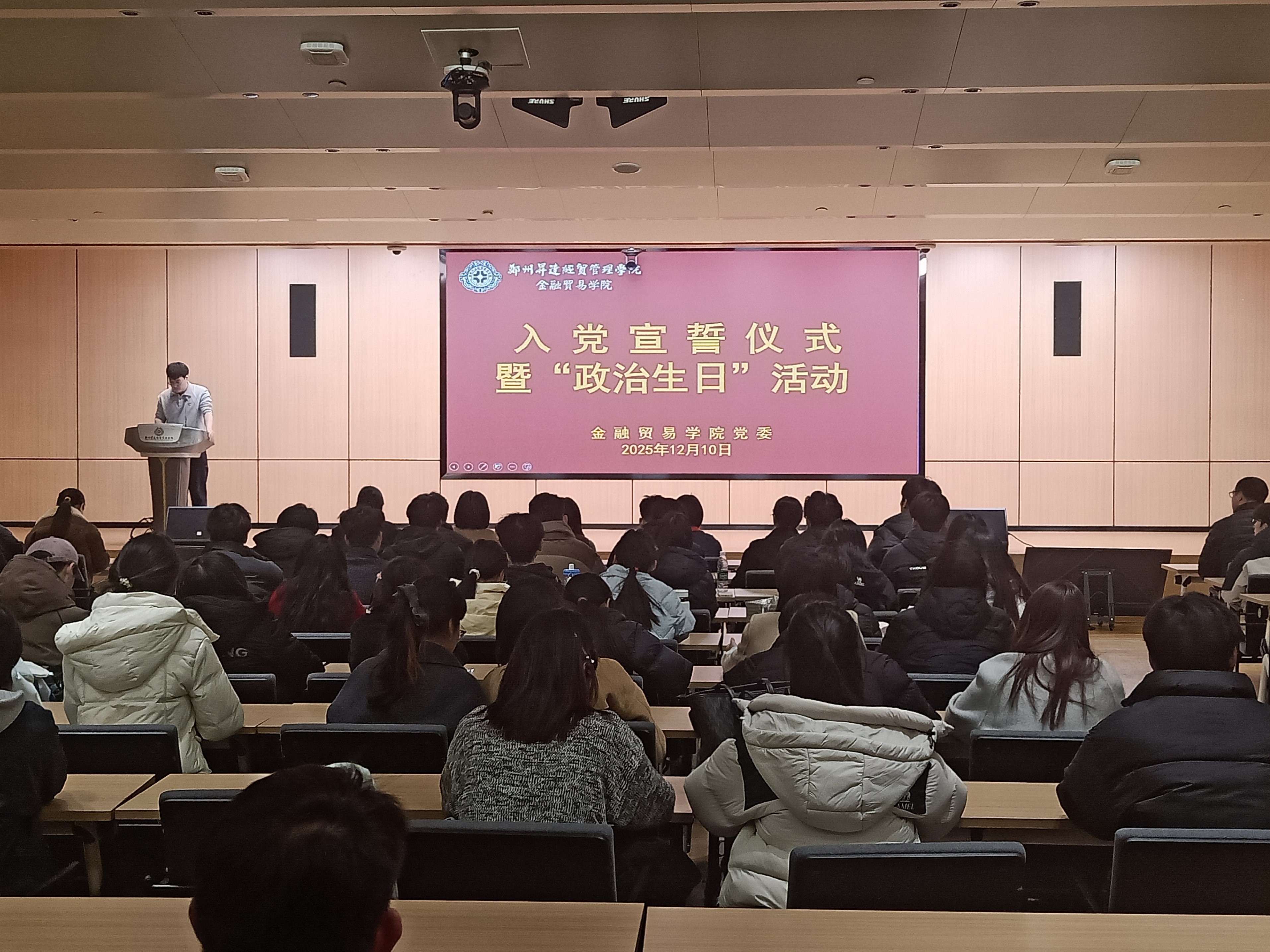 为严格规范党员发展程序,强化党员党性教育,切实增强新发展党员的责任感、使命感和组织归属感,12月10日,金融贸易学院党委在图书馆二楼报告厅隆重举行新发展党员入党宣誓仪式暨“政治生日”活动。学院党委书记张小雁、党委副书记王娟、各学生党支部书记及全体新发展党员参加仪式。仪式由组织员武世鹏主持。