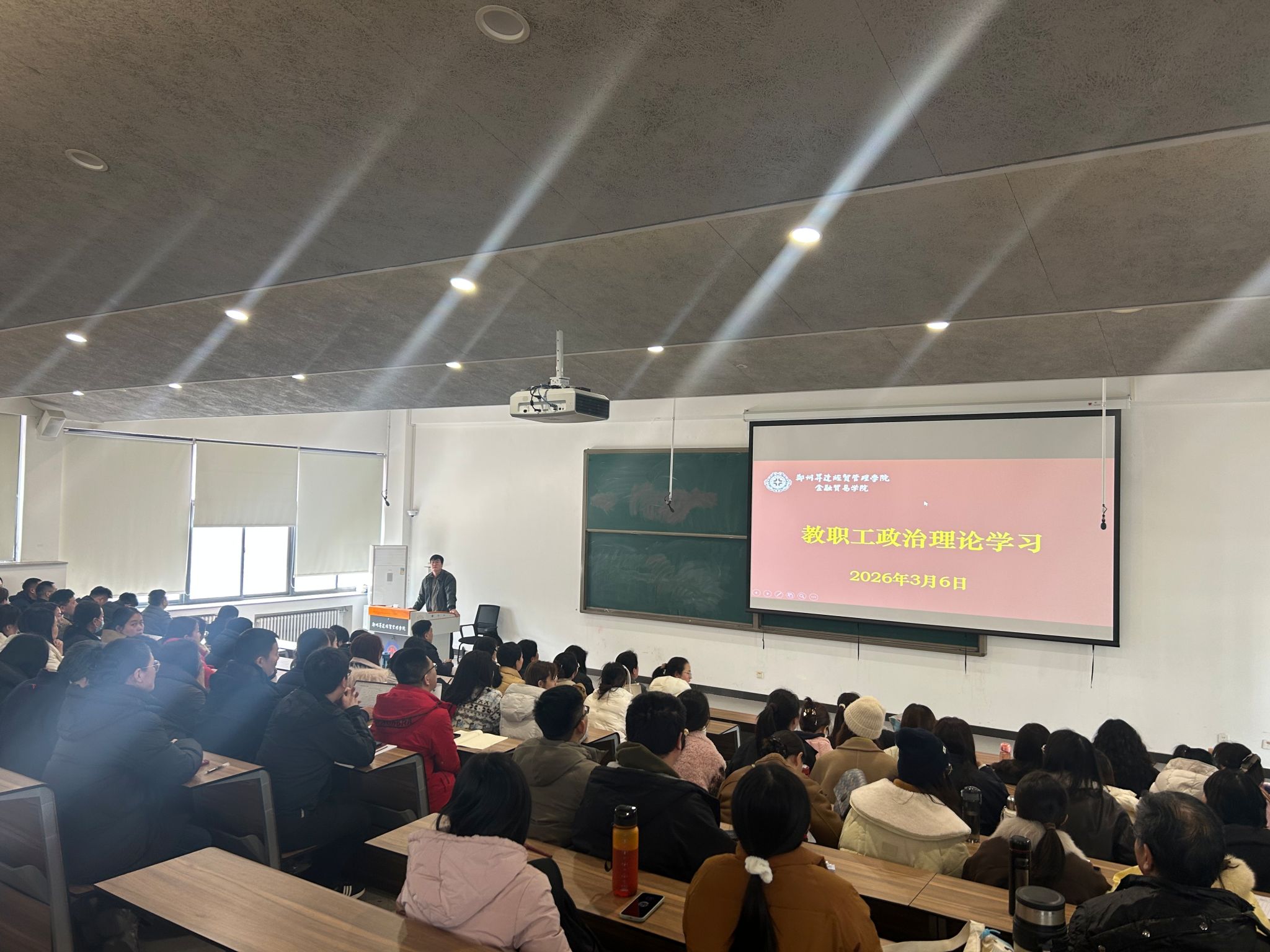 3 月 6 日,金融贸易学院在107教室组织开展教职工政治理论学习会议,专题学习中共中央政治局会议精神,学院全体教职工参加学习。