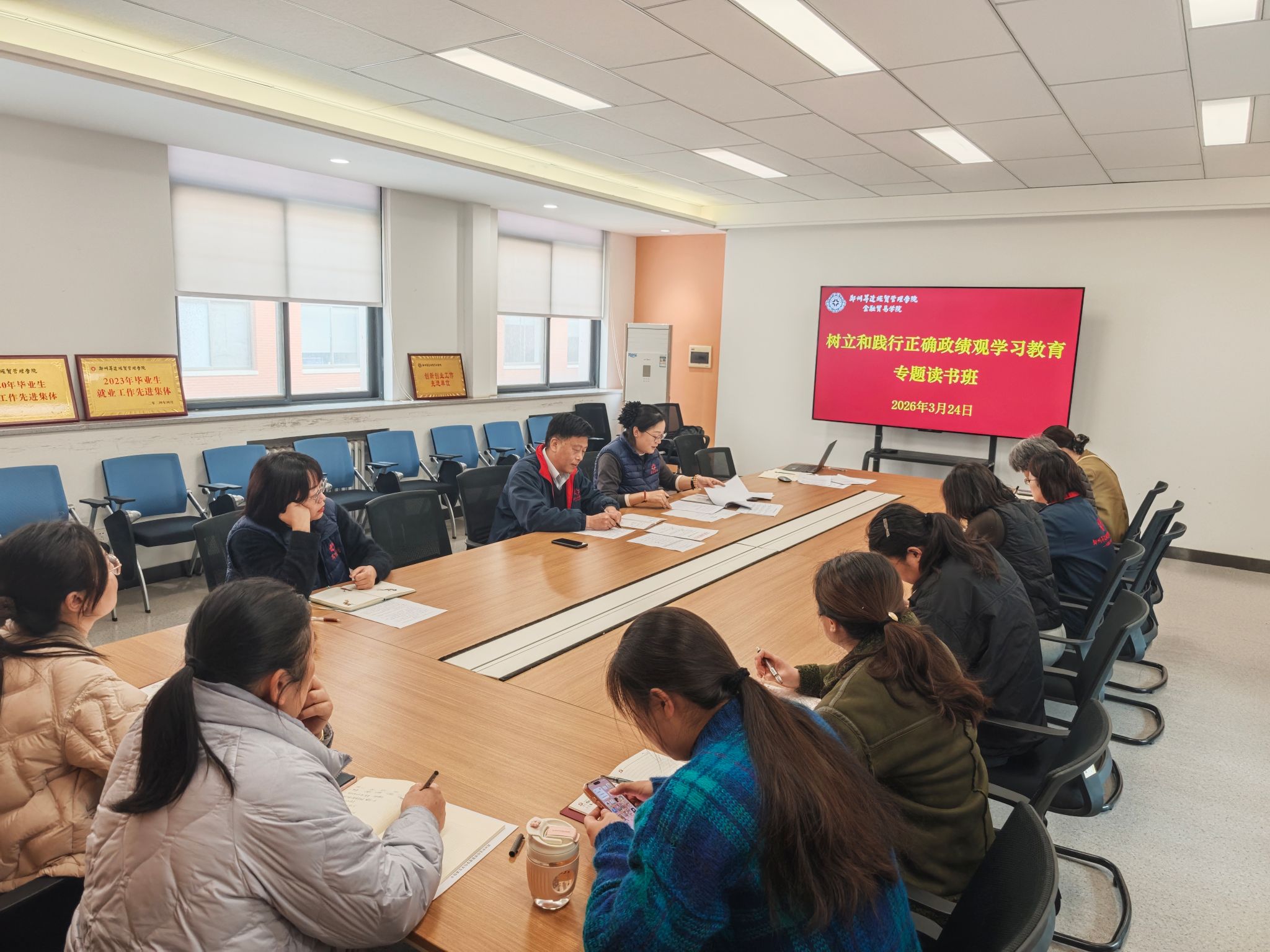 3月23日至24日,学院党委举办树立和践行正确政绩观学习教育读书班暨党委理论学习中心组学习会议。读书班期间,与会同志采取集中学习、个人自学和交流研讨相结合的方式,原原本本研读《习近平关于树立和践行正确政绩观论述摘编》,进一步增强政治自觉、思想自觉、行动自觉,以实干实绩推动“十五五”开好局、起好步。23日上午,读书班举行集中学习,党委书记张小雁带头领学《习近平关于树立和践行正确政绩观论述摘编》第一章,其他委员同志依次领学部分章节。