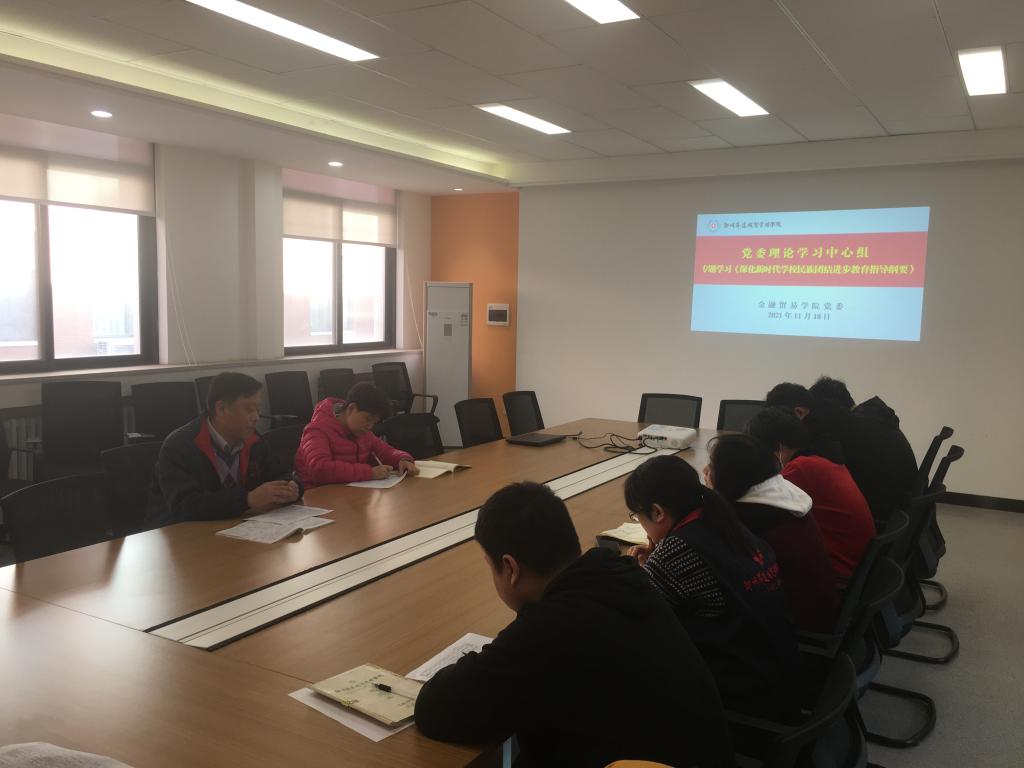 为深化高校教育,筑牢民族团结根基,重点学习马克思主义和党的民族基本理论,树立马克思主义民族观。11月18日上午,金融贸易学院党委理论学习中心组在3号楼212会议室专题学习《深化新时代学校民族团结进步教育指导纲要》。学院何伟院长、党委书记钟江鸽、杨毅副院长和学院理论学习中心组成员参加了本次专题学习会。