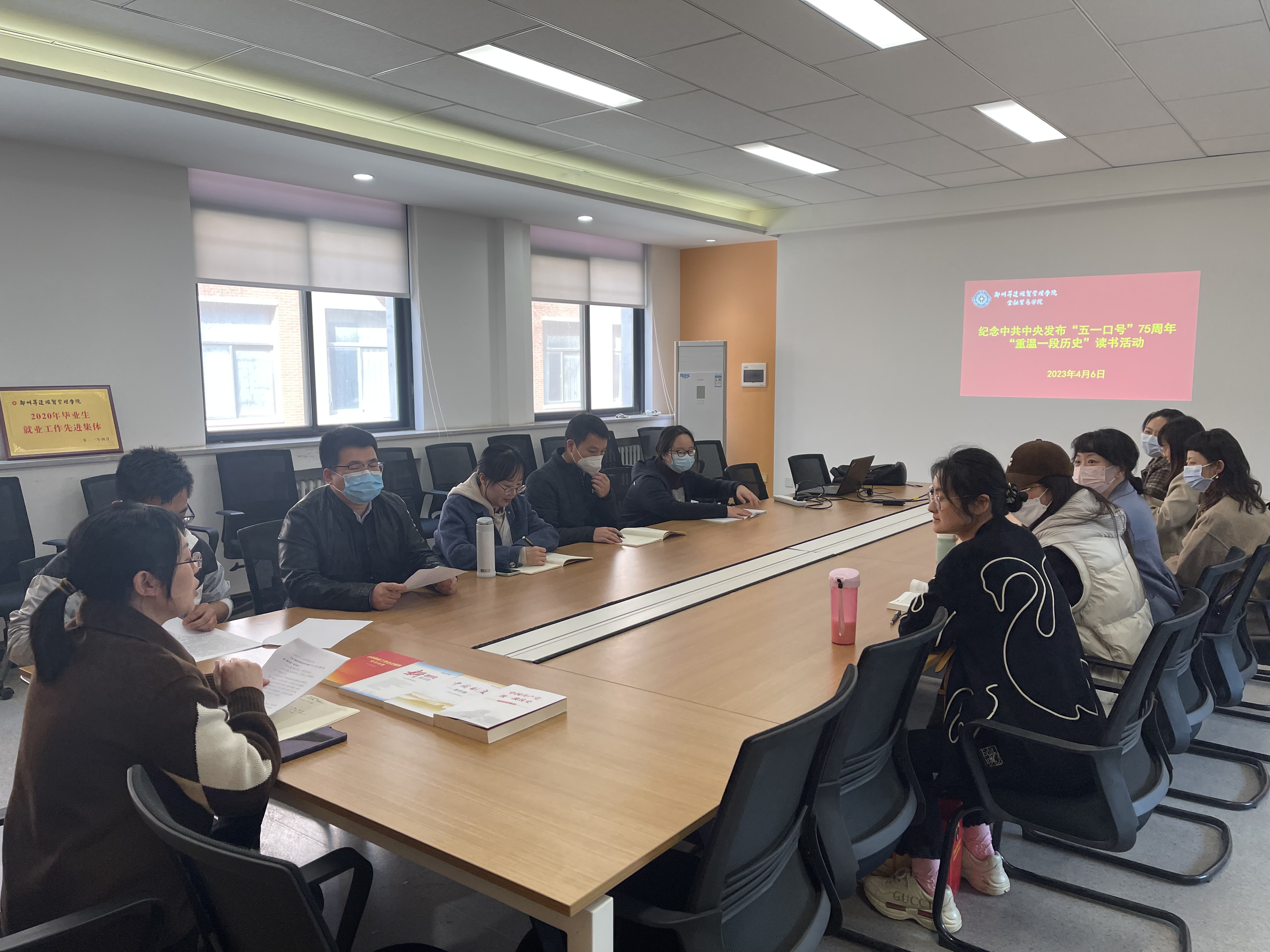 金融贸易学院于4月6日下午在3号楼212会议室举行了纪念中共中央发布“五一口号”75周年“重温一段历史”读书活动。本次活动旨在通过读书的方式,缅怀历史,传承红色基因,激发爱国热情,增强国家意识和民族自豪感。