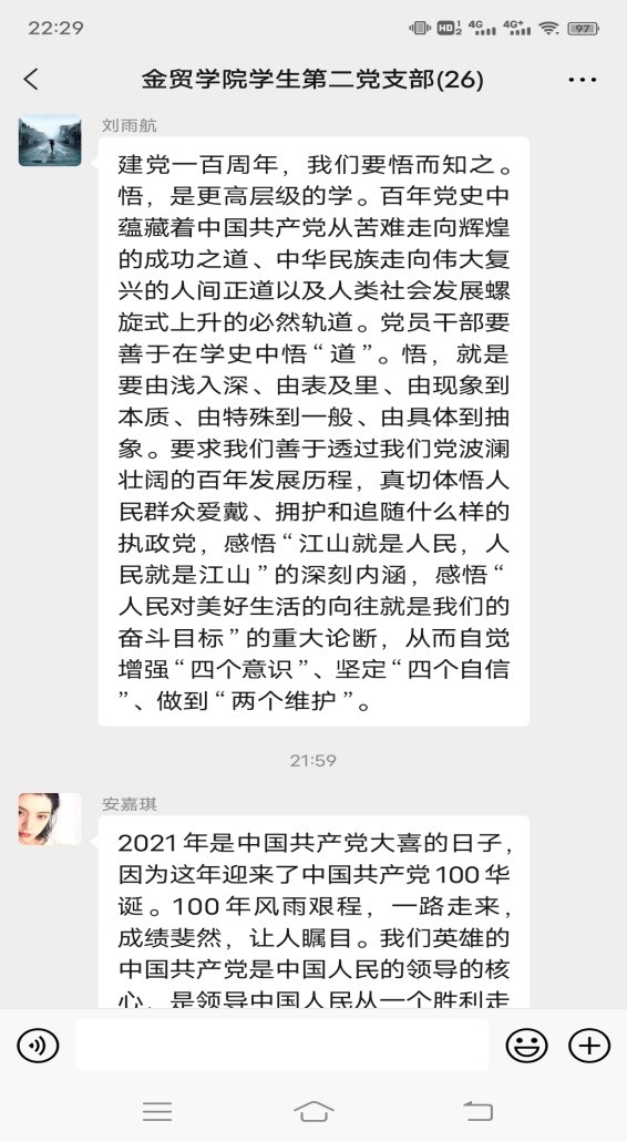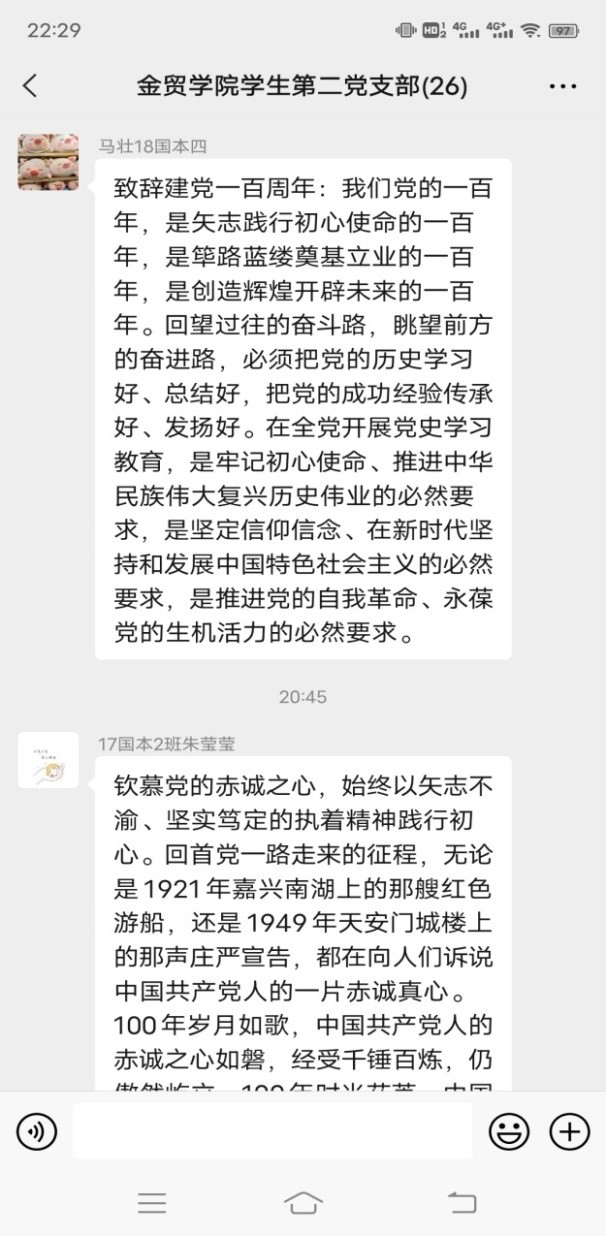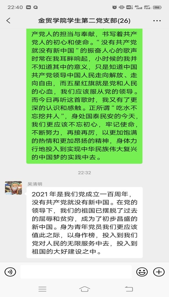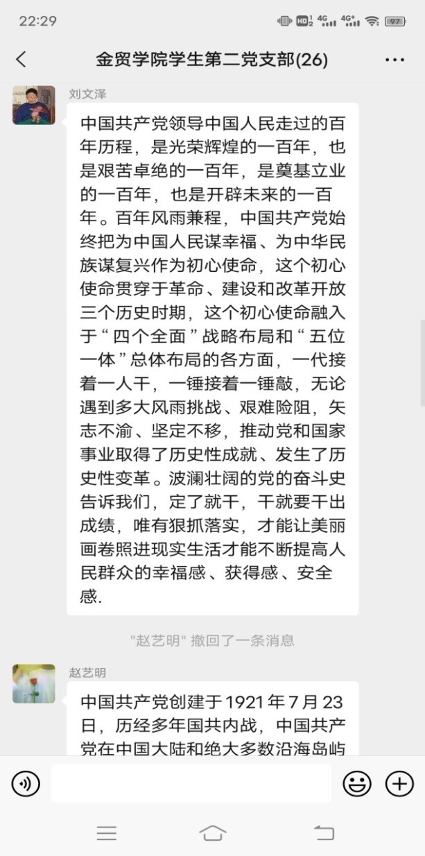 2021年是中国共产党成立100周年,从1921年成立以来,党已经走过了100年艰辛而辉煌的风雨历程。我们都知道,党的历史是中华民族的独立、解放、繁荣和为中国人民的自由、民主、幸福而不懈奋斗的历史。这100年是我们党经受各种风浪考验、不断发展壮大,不断开创各项事业新局面的100年。对于我们这些青年学生,都必须要认真学习、正确认识党的光辉历史和伟大功绩,并永远铭记在心。我们第二党支部于4月27日组织一起线上学习了建党一百年的主题教育活动。