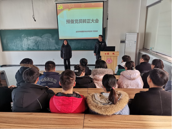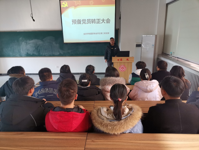 2021年12月2日金贸学院国贸专业学生第二党支部在教学3号楼210教室召开本学期预备党员转正大会。 支部全体党员师生参加了会议,会议由支部书记毕虹老师主持。