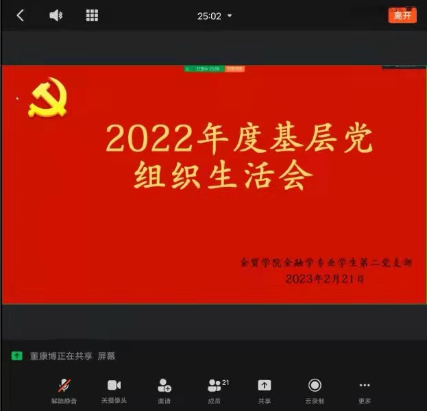 为深入学习贯彻习近平新时代中国特色社会主义思想和党的二十大精神,进一步加强基层党组织建设,规范党内政治生活,增强党员党性修养,2023年2月21日,金融贸易学院金融学专业学生第二党支部线上召开了2022年度组织生活会,会议由支部书记王一柳主持。