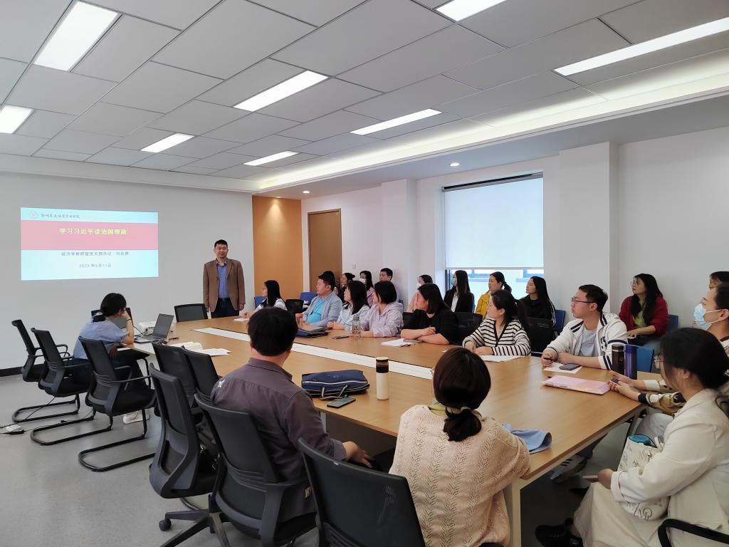 为深入开展学习贯彻习近平新时代中国特色社会主义思想主题教育,进一步深刻理解马克思主义中国化、时代化的最新成果,切实发挥党建引领力和统揽力,强化党对数字经济发展的集中统一领导,5月11日中午,金融贸易学院经济学教研室党支部书记刘合群同志带领党支部全体党员同志在3号楼210教室集中学习《习近平谈治国理政》第四卷“不断做强做优做大我国数字经济”。