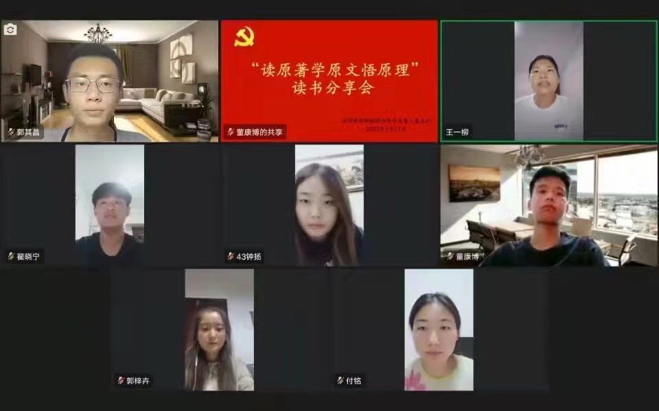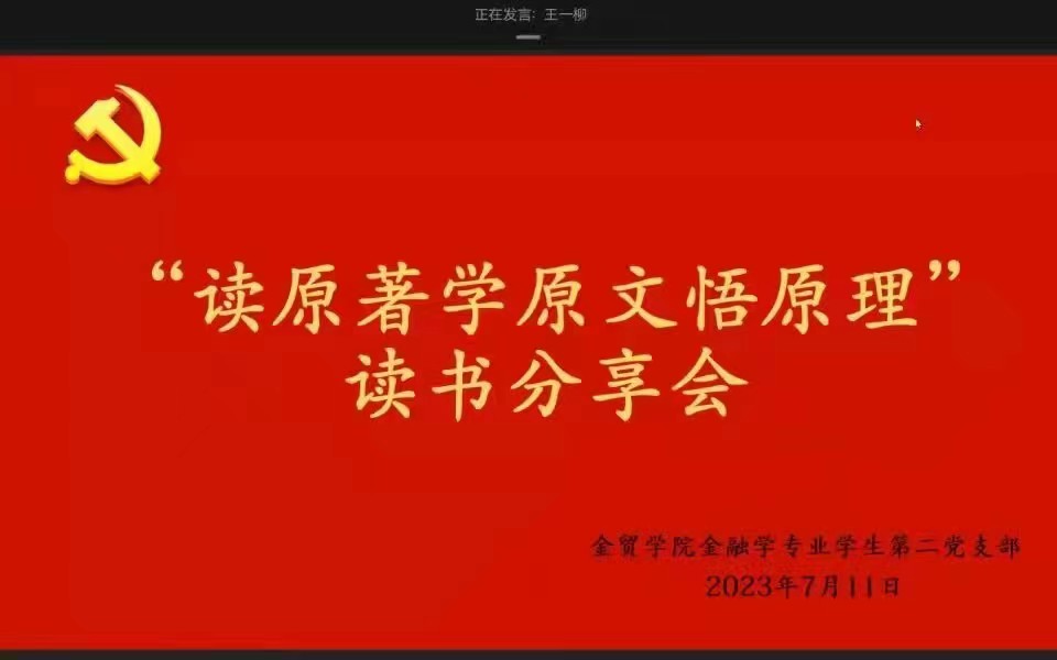为扎实开展学习贯彻习近平新时代中国特色社会主义思想主题教育,金融学专业学生第二党支部于7月11日通过钉钉会议线上召开“读原著 学原文 悟原理”读书分享会,支部全体党员参会,会议由支部书记王一柳主持。