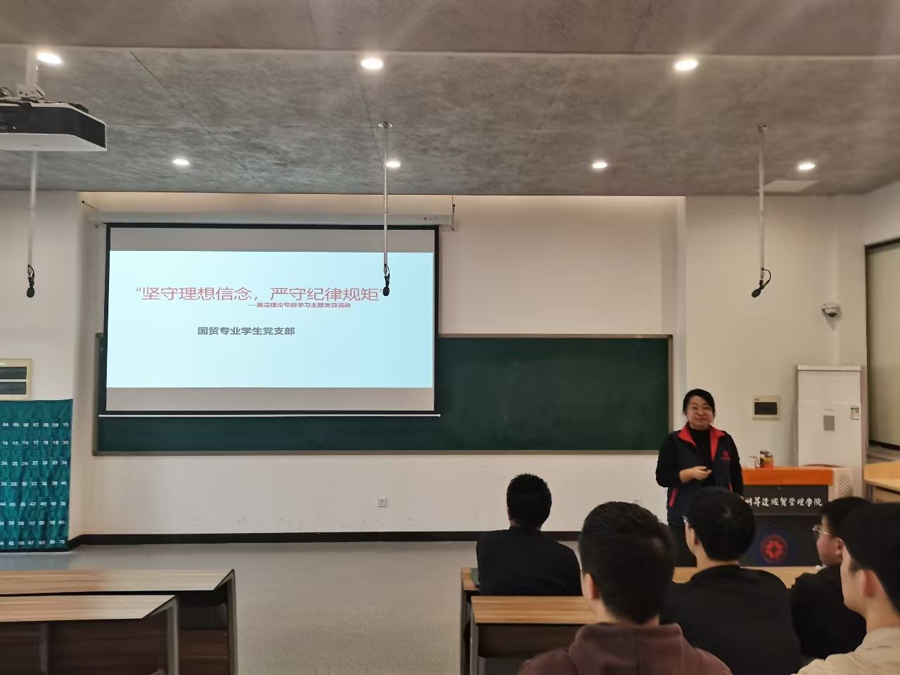 为进一步强化党支部党员师生廉洁自律意识,坚定理想信念,严守纪律规矩,10月30日,国贸专业学生党支部开展主题党日活动。