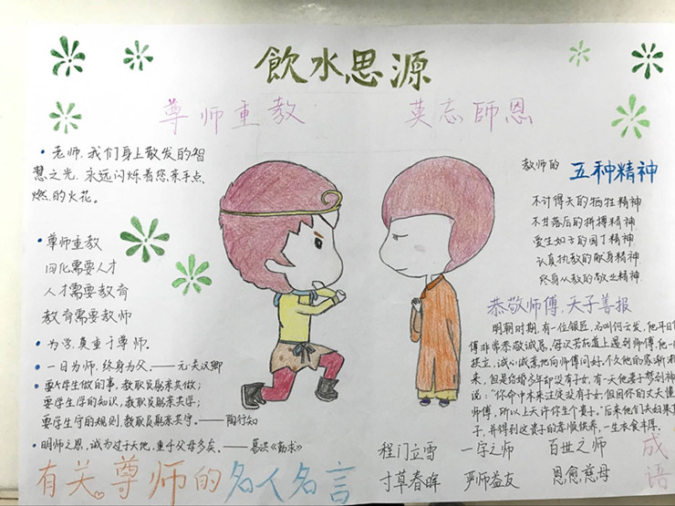 尊师敬师重在落实。此次活动征集上来的手抄报,每一份无不展现出学子对老师的尊重与敬爱之情,也为此次文明礼貌月活动添上了一抹亮丽的色彩。尊师敬师的精神在我们这一代青年人的身上得到了传承和发扬。从古代的“张良拜师”、“程门立雪”,到现代伟大领袖毛主席尊敬老师的故事,都告诉了我们中华民族从来都是一个尊师的民族,一个知恩的民族。作为新时代的青年,我们更应以优秀的学业成绩和实践活动来感怀老师传授知识的不易!