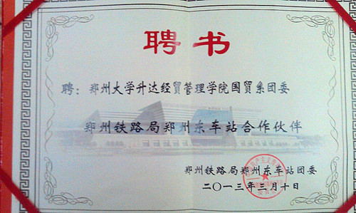 为圆中国梦,树立典型,提高学生参与社会服务的热情,国贸系团委、青年志愿团队多次到郑州铁路局东站进行“传承服务使命,践行雷锋精神”志愿者服务系列活动。近日,郑州铁路局郑州东车站团委为我系团委颁发了聘书,与国贸系团委正式成为合作伙伴。
