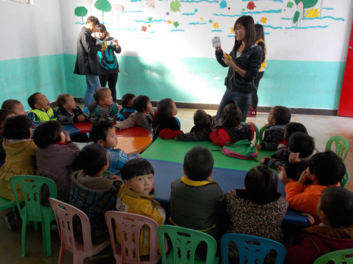 到达目的地后,在副社王永慧与幼儿园老师的沟通下,将志愿者们分为三人一组到每个班级任教,负责下午的教课内容。学生们背诵了《大学》、《诗经》等来表达对爱心支教的志愿者的欢迎,志愿者们为每位学生分发了糖果。随后,支教老师教学生识字、唱歌、画画等,学生们全神贯注,认真听讲。讲故事环节赢得了众多学生的喜爱,老师们用各自独特的方式和学生沟通、讲课,营造了活跃的课堂气氛。