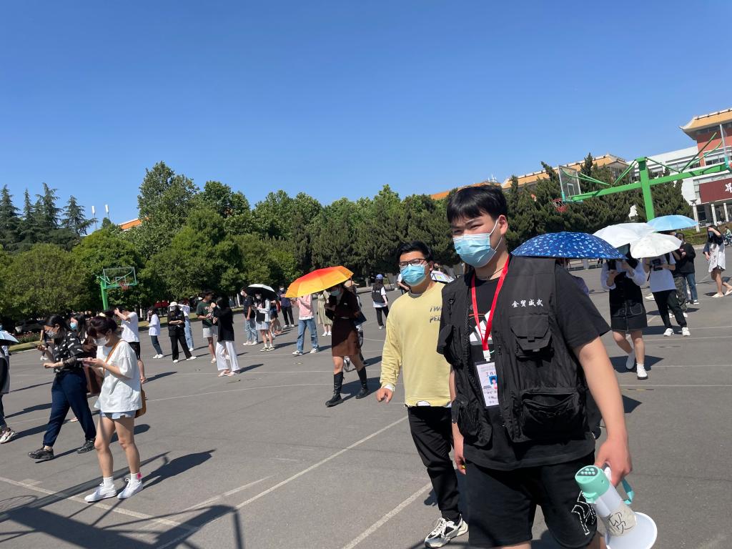 本学期,疫情防控形势紧张,作为金贸学院学生骨干,申晓阳同学共组织出勤核酸检测工作13次,主要负责核酸检测时的秩序维护工作。为了保证间隔两米,不管是烈日当头还是刮风下雨,申晓阳同学总会在核酸检测前一天到现场一个一个检查地标有无缺失,及时修补,确保核酸检测有序进行。核酸检测进行中,申晓阳同学组织志愿者团队,不间断提醒同学们提前打开核酸登记码,保持两米间隔的距离排好队伍;并引导同学们不插队、不掉队,文明有序等待检测。