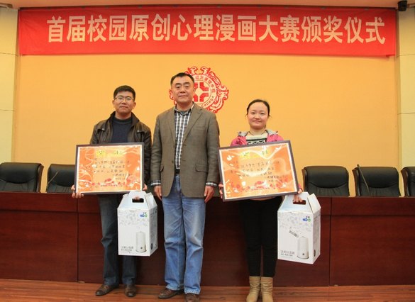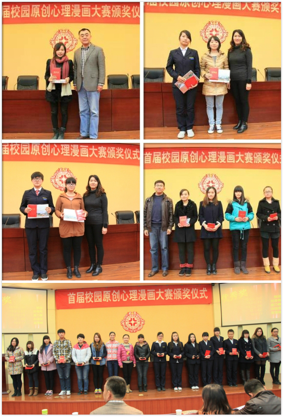 12月12日下午,由心理健康教育中心主办的“放飞梦想”首届校园原创心理漫画大赛颁奖仪式在国际会议厅隆重举行。心理健康教育中心张现水主任、文法系行政秘书郑玲玲、会计系一部行政秘书陈刚和艺术系行政秘书曹华莹出席了颁奖仪式。各系参加漫画大赛的学生和心桥协会的成员参加了本次仪式。