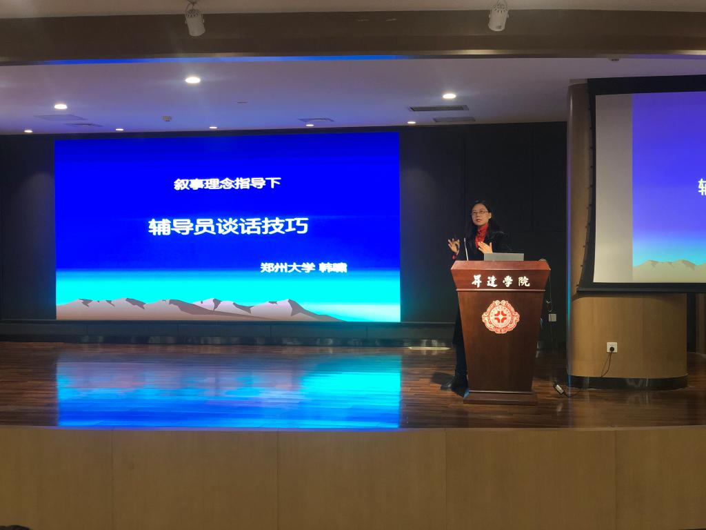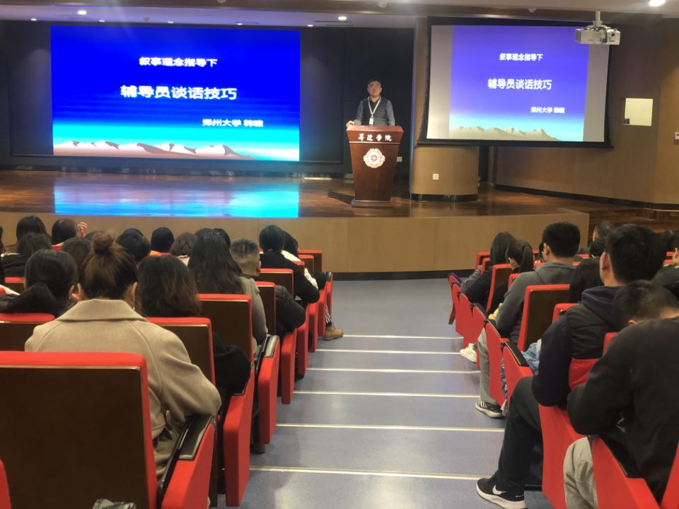 12月12日上午,由心理健康教育中心组织的辅导员心理健康教育专题培训在双创大讲堂举行。郑州大学教育学院韩啸老师应邀为我校辅导员作了《叙事视角下的辅导员谈话工作技术》的专题讲座。张金安副校长、各学院行政秘书和全体辅导员参加了培训,培训会由心理健康教育中心主任张现水主持。