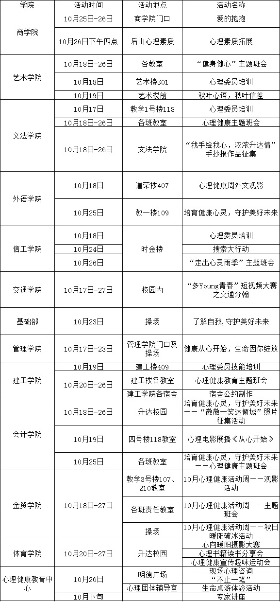 心理健康教育中心和各学院主要活动安排如下,具体安排详见各学院通知,欢迎同学们积极参加!