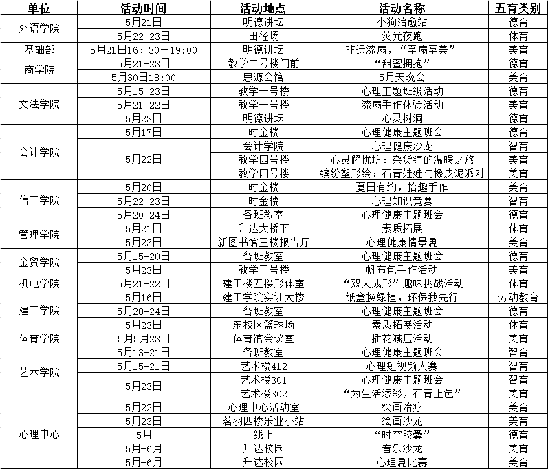 心理健康教育中心和各学院主要活动安排如下,具体安排详见各学院通知,欢迎同学们积极参加!