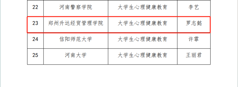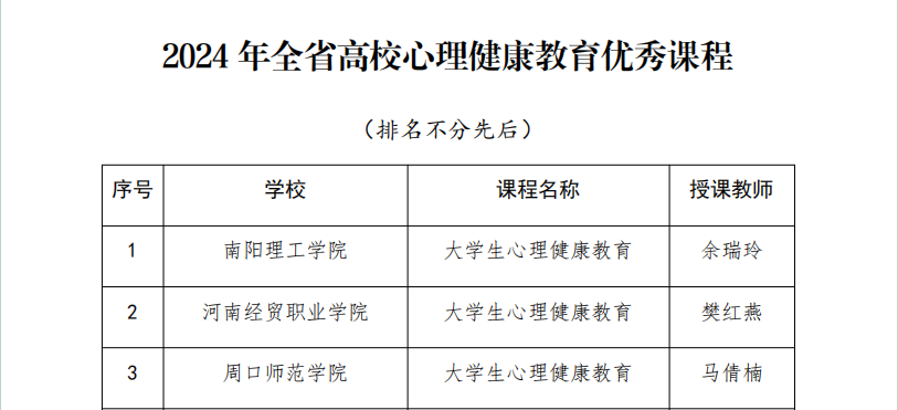 根据河南省委教育工委、河南省教育厅《关于公布全省高校大学生心理健康教育优秀课程及心理危机干预案例评选结果的通知》,我校心理健康教育中心教师罗志懿申报的课程《大学生心理健康教育》入选“2024年全省高校心理健康教育优秀课程”、胡学博申报的心理危机干预案例入选“2024年全省高校心理危机干预优秀案例”。