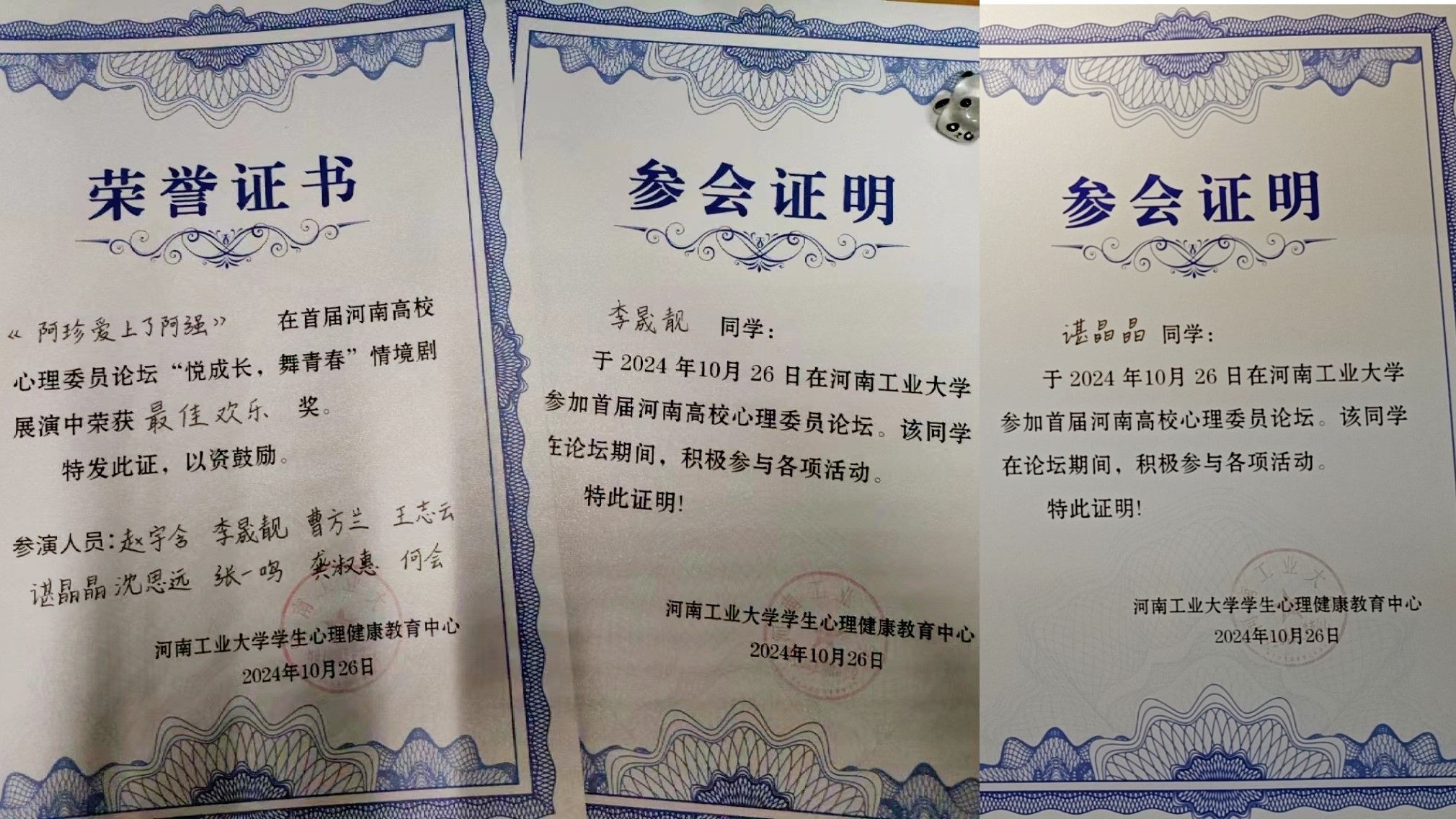 心理健康教育中心胡学博科长、梁钊老师及两名学生心理委员李昇靓、谌晶晶受邀参加了河南省首届高校心理委员论坛,聚焦心理健康教育和心理委员工作。论坛上,省教育厅领导强调了心理健康的重要性,并对心理委员在学生心理健康工作中的积极作用表示肯定。在心理委员分享经验案例展示环节,来自不同高校的心理委员分享了各自在岗位上的经验和心得体会,为在座的心理委员提供了宝贵的经验。“悦成长,舞青春”心理情景剧展演环节,参会心理委员临时分组,即兴创编,集思广益,展示了有关恋爱、宿舍关系等精彩剧目。胡学博科长受邀担任情景剧评委,李昇靓、谌晶晶同学和其他高校参会心理委员组队创编的剧目获得了“最佳欢乐奖”。