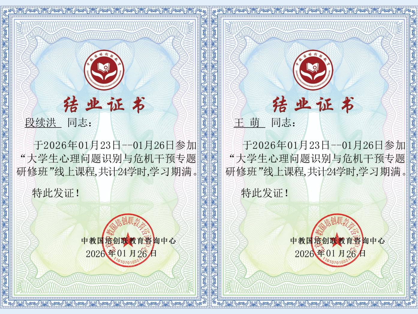 为进一步提升学院辅导员队伍的心理育人工作水平,增强对学生心理危机的识别与干预能力,筑牢校园安全防线,2026年1月23日—1月26日,建工学院辅导员段续洪、王萌参加了由中教国培创联教育咨询中心举办的《大学生心理问题识别与危机干预专题研修班》线上培训。