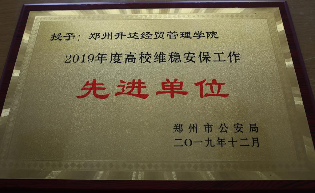 在全校师生的共同努力下,我校2019年维稳安保工作取得了突出成绩,全年未发生任何安全事故,确保了校园安全稳定环境,被评为郑州市公安局“2019年度高校维稳安保先进单位”,副校长张金安、学务长张现水、校长办公室主任朱永恒、党委办公室主任秦旻4人被评为郑州市公安局“维稳安保工作先进个人”。
