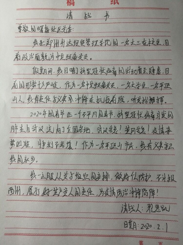 “2020年的春节是一个不平凡的春节。新型冠状病毒引发的肺炎自武汉流向了全国各地,疫情来势凶猛,斗争刻不容缓!作为一名当代大学生,一名共产党员,我有义务守卫我的家乡。”这是文法学院17新闻班班长翟思凯同学向自己家所在的平顶山曙南社区党委写的“请战书”中的一段话。