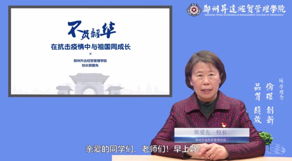 校长郭爱先教授以《不负韶华 在抗击疫情中与祖国同成长》为题开讲。郭校长情真意切用具体事例深刻阐释了党的领导是我们打赢这场攻坚战的胜利保证,逆行的医护人员是我们健康平安的守护天使,人民群众是战胜疫情的铜墙铁壁,疫情防控工作展现出的中国速度、中国规模、中国效率充分彰显了中国制度之优越、中国人民之伟大!并对升达师生在抗击疫情中所做的贡献给予充分肯定。她寄语全校师生要尊重生命、敬畏自然,心怀感恩、敬畏道德,充实自我、勤学广读,从读书中得到智慧启发、滋养浩然之气,真正让自己居家的时间丰盈起来,让自己的思想深邃起来,让自己的人生丰厚起来,坚定信心,不负韶华,在抗击疫情中与祖国同成长!