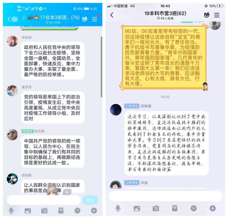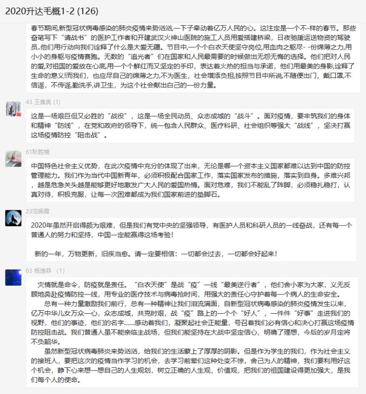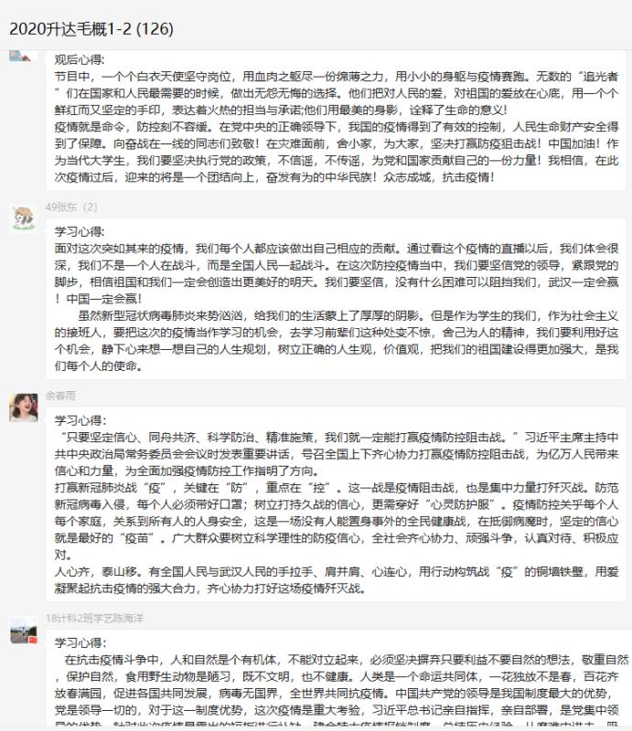 磨难压不垮,奋起正当时。3月9日下午,教育部社科司与人民网联合组织“全国大学生同上一堂疫情防控思政大课”。在学校的安排部署下,我校师生通过人民网教育频道、人民网人民智云客户端、咪咕视频客户端、人民视频客户端等线上同步收看学习艾四林、秦宣、王炳林、冯秀军四位教授的思政大课,共享这份精神上的饕餮大餐,分享自己的感悟和思考。