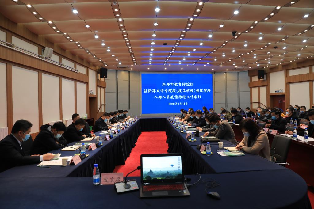 3月14日上午,新郑市教育防控部驻新郑大中专院校(技工院校)强化境外入郑人员疫情防控工作会议在我校行政大楼国际会议厅召开。郑州市教育局副局长葛飞、高教处处长郭玉兵,新郑市委副书记曹东锋,新郑市委常委、宣传部长张慧娴,新郑市人大常委会副主任王金灿,新郑教育园区管委会副主任张顺安,新郑市教体局党组书记兼局长刘学敏、副局长张宏亮、王俊丽,我校执行董事王新奇、副校长兼工会主席张金安及驻新郑大中专院校(技工院校)分管领导,驻新郑大中专院校(技工院校)所在乡镇(街道、管委会)责任领导,联合督导组高校组正副组长、中专组组长等参加了会议。会议由张慧娴部长主持。