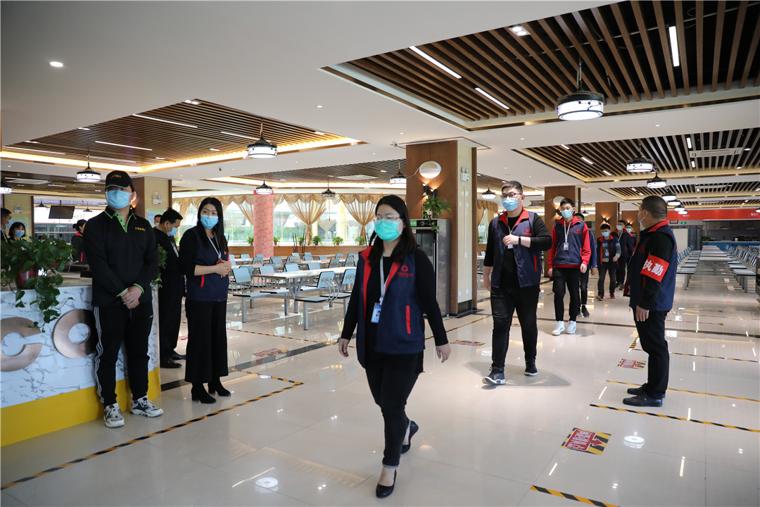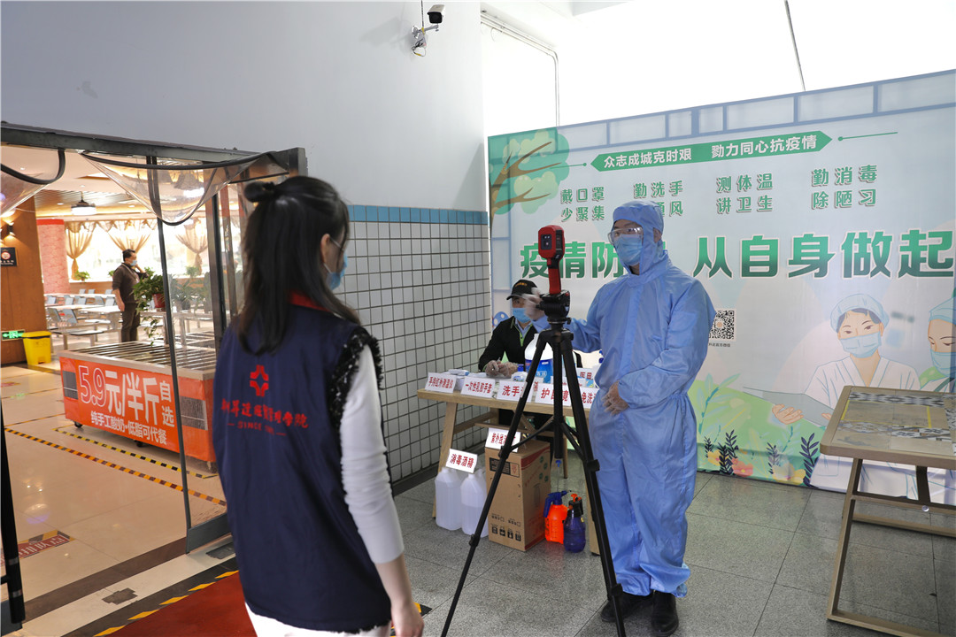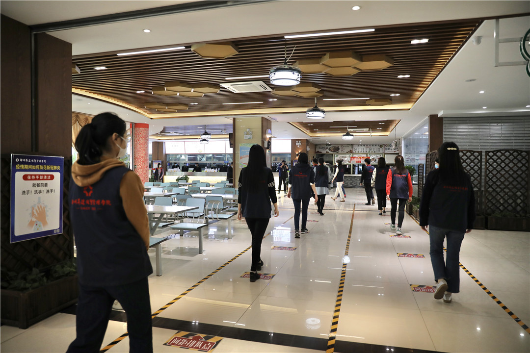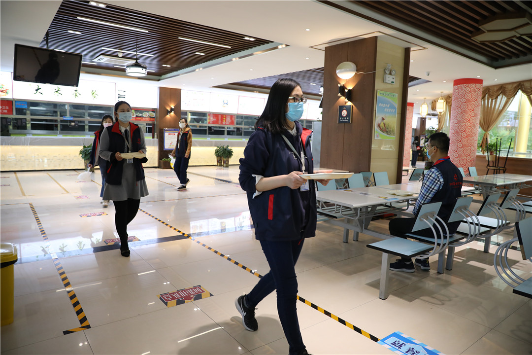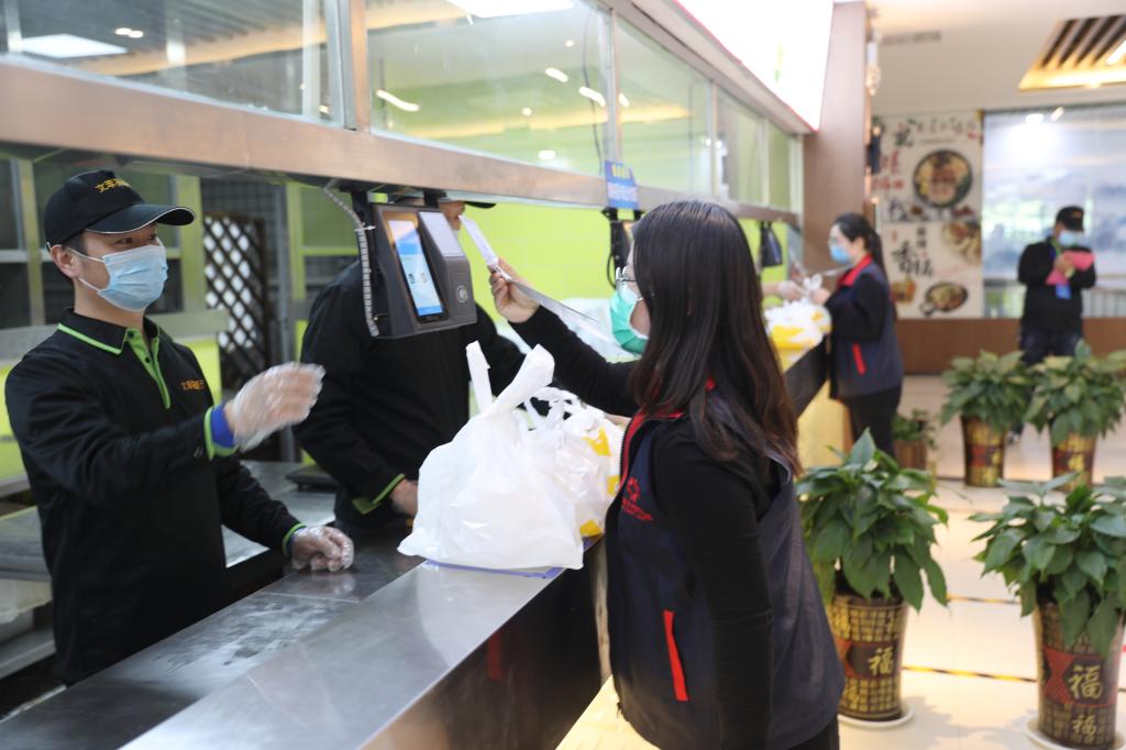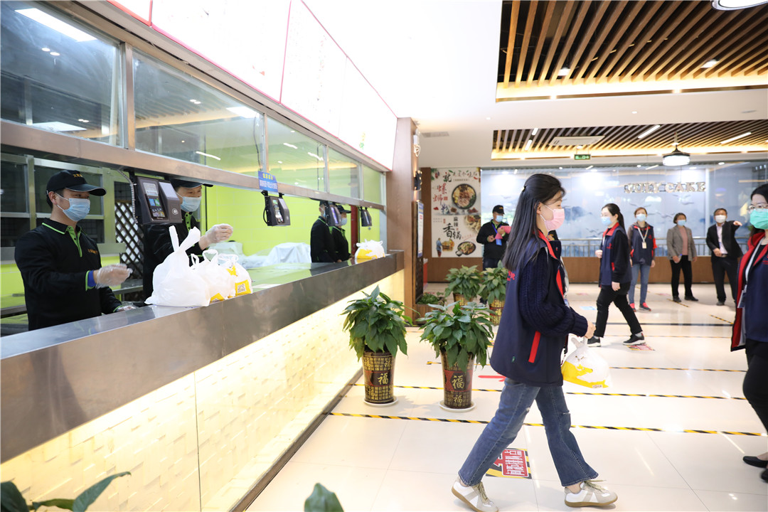 购餐时,“学生”按照标线标识间隔1.5米,有序排队购餐。购餐后,“学生”无接触刷卡付款,可打包在宿舍就餐,也可选择在餐厅指定区域就餐。