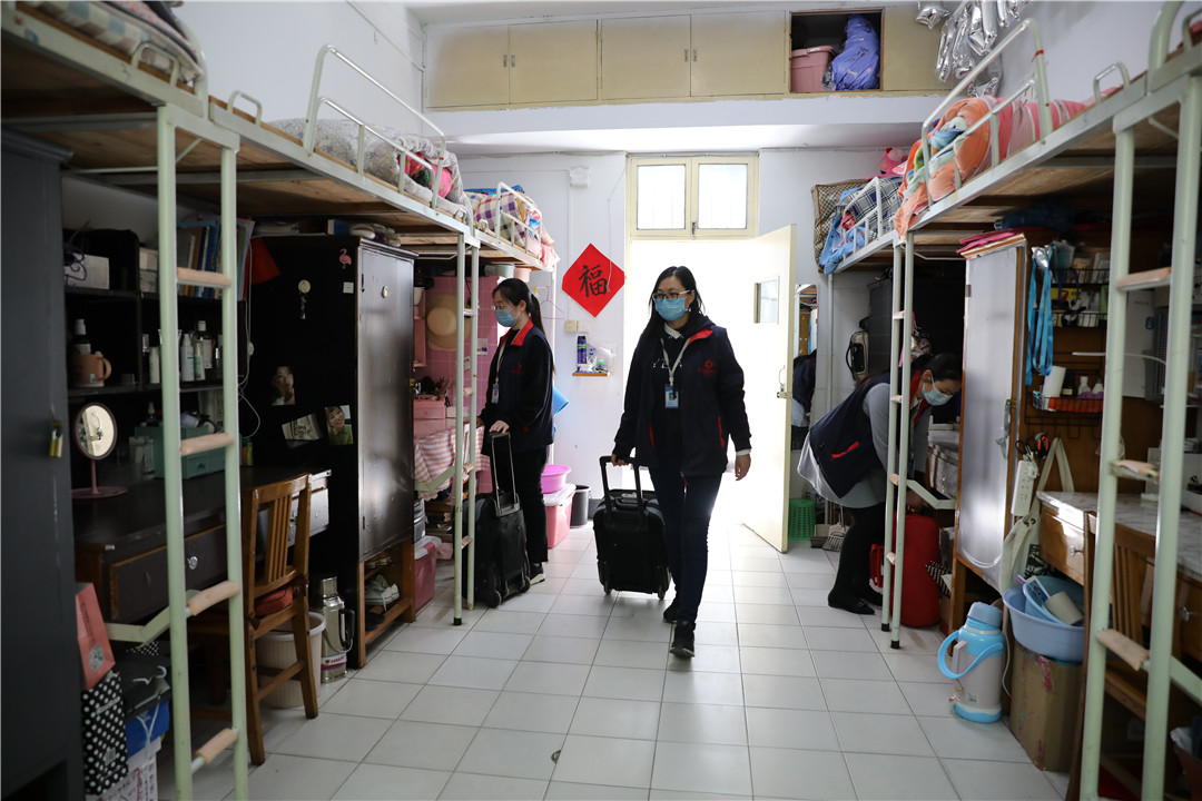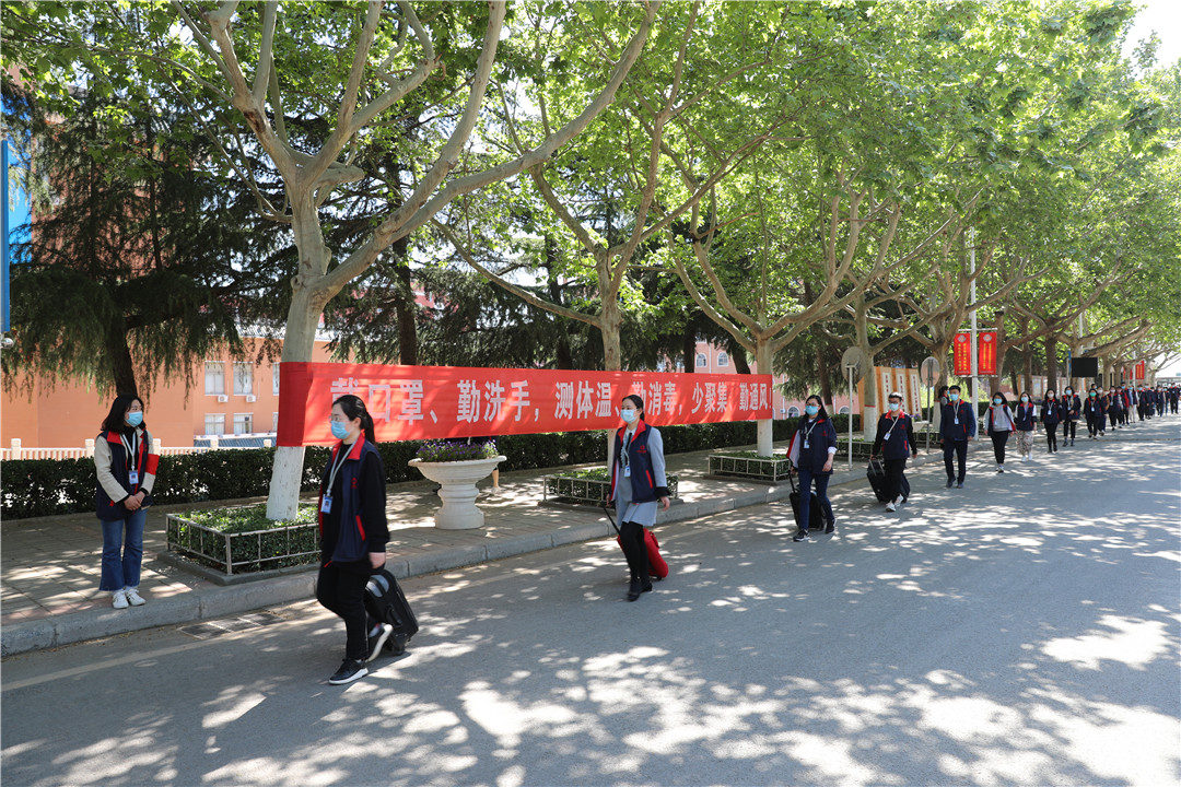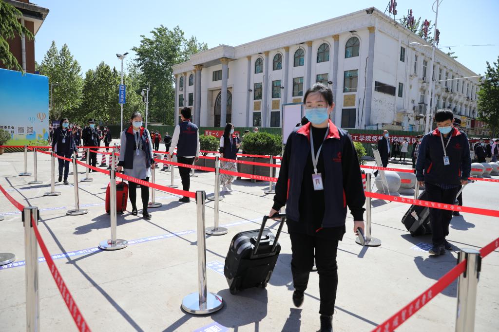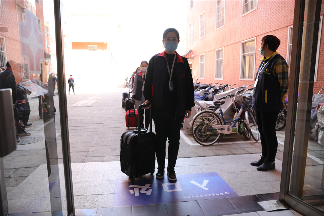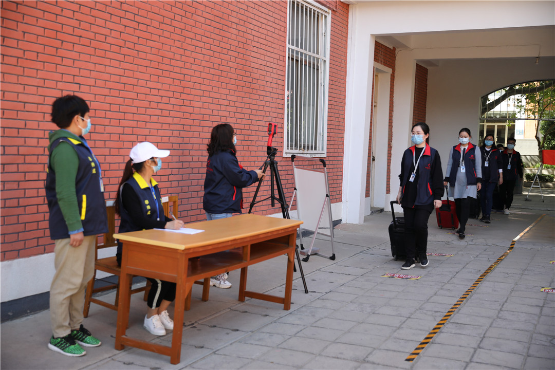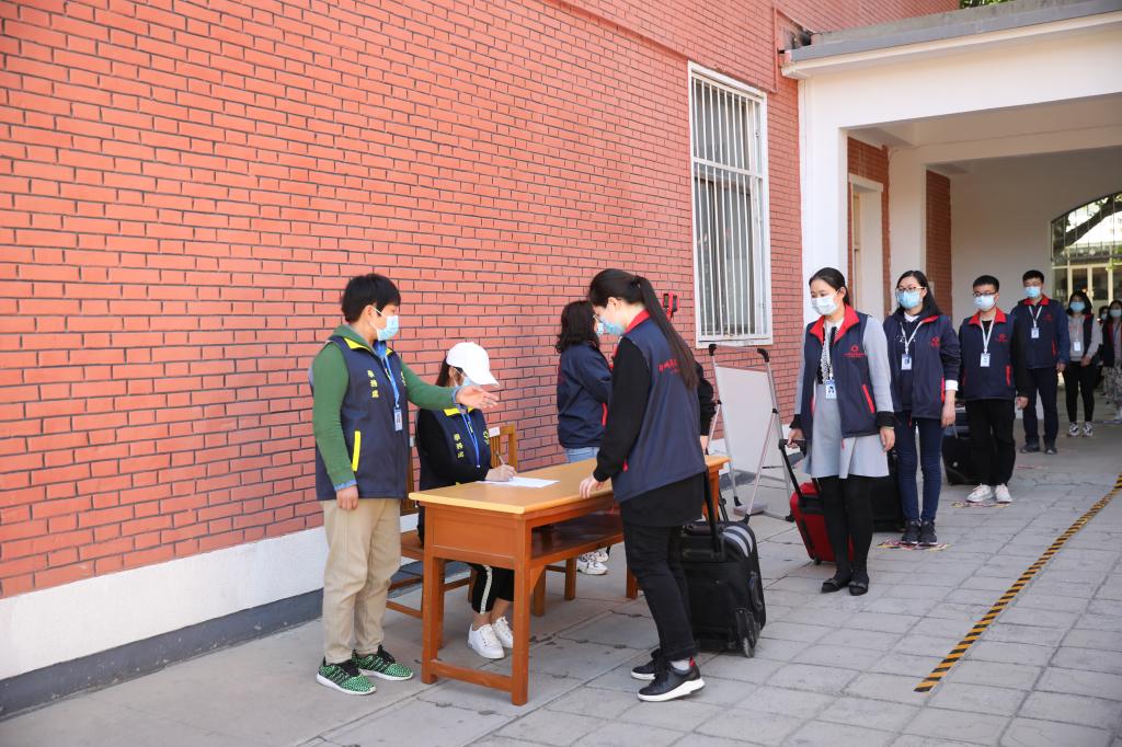“学生”报到后进入校园,依次排队返回宿舍。沿途工作人员督促“学生”按照预定路线返回宿舍,间隔1.5米以上距离,严禁在校园内闲逛。