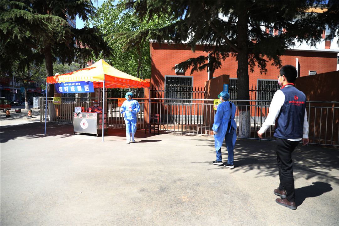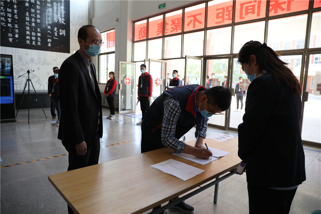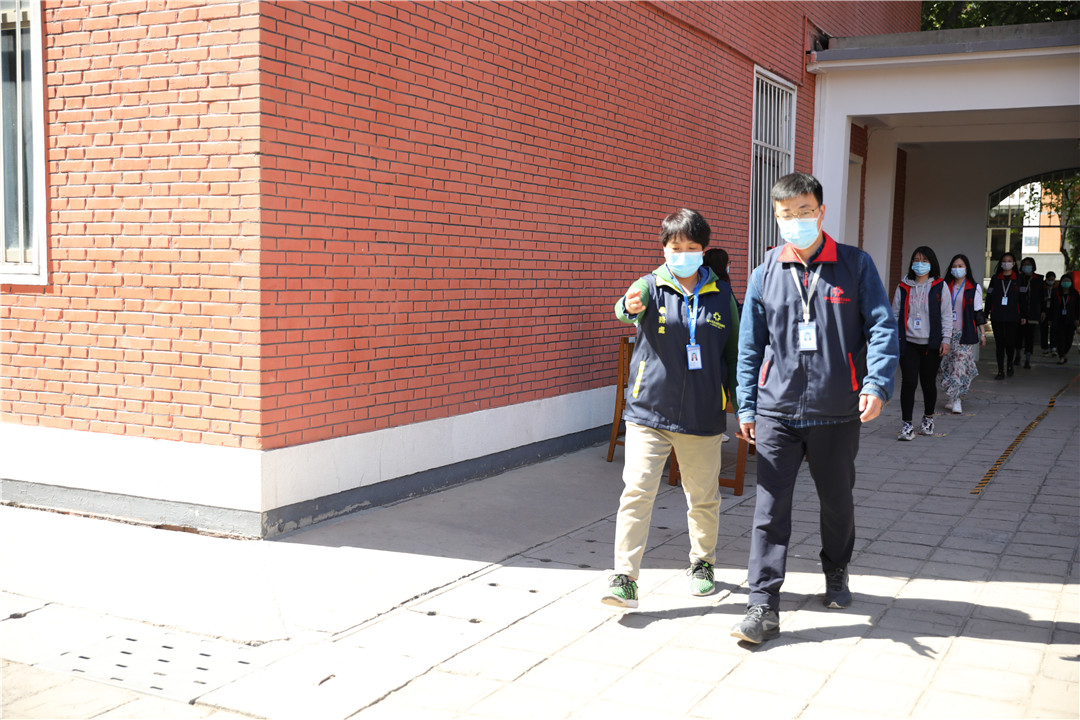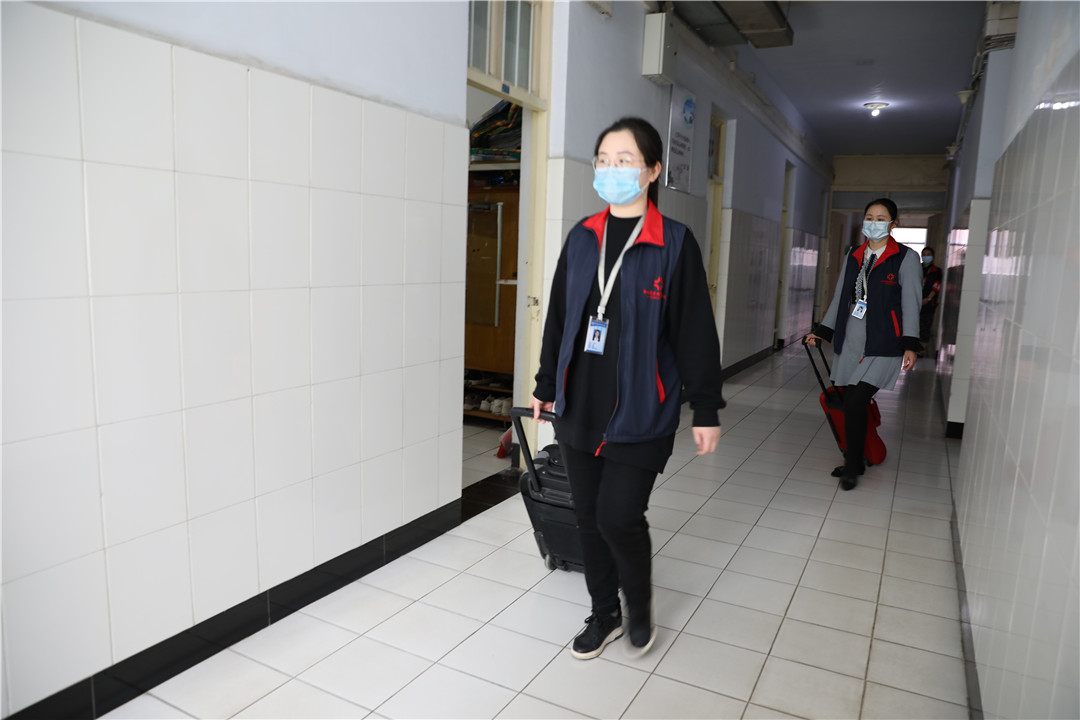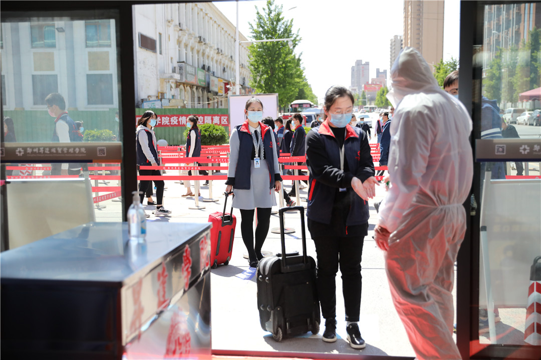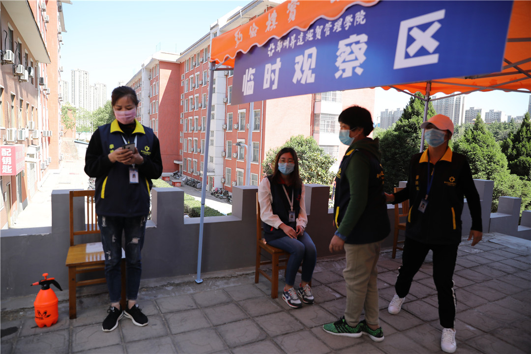 “学生”报到后进入校园,依次排队返回宿舍。沿途工作人员督促“学生”按照预定路线返回宿舍,间隔1.5米以上距离,严禁在校园内闲逛。