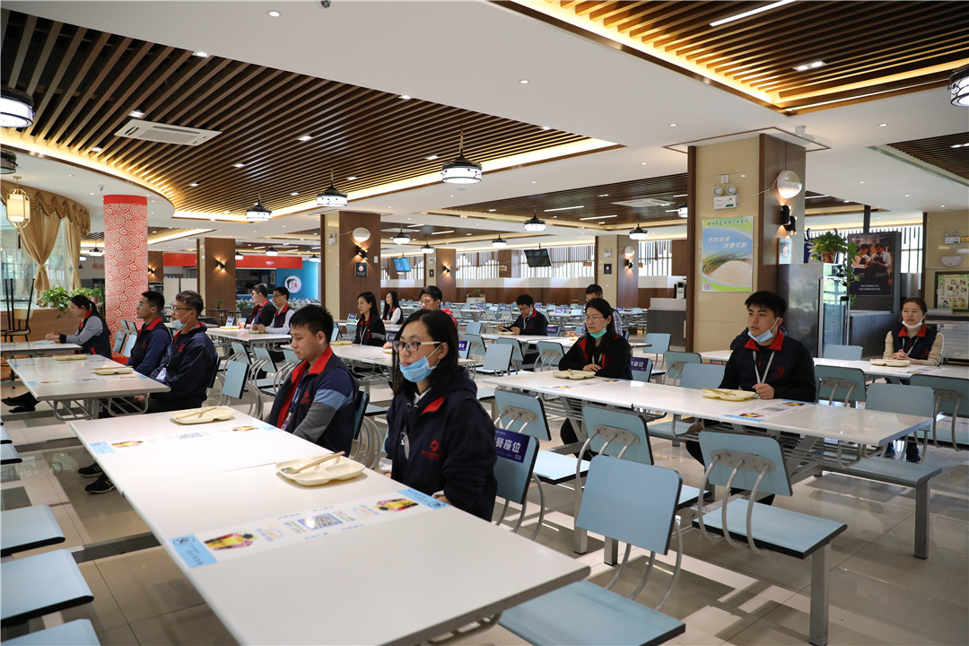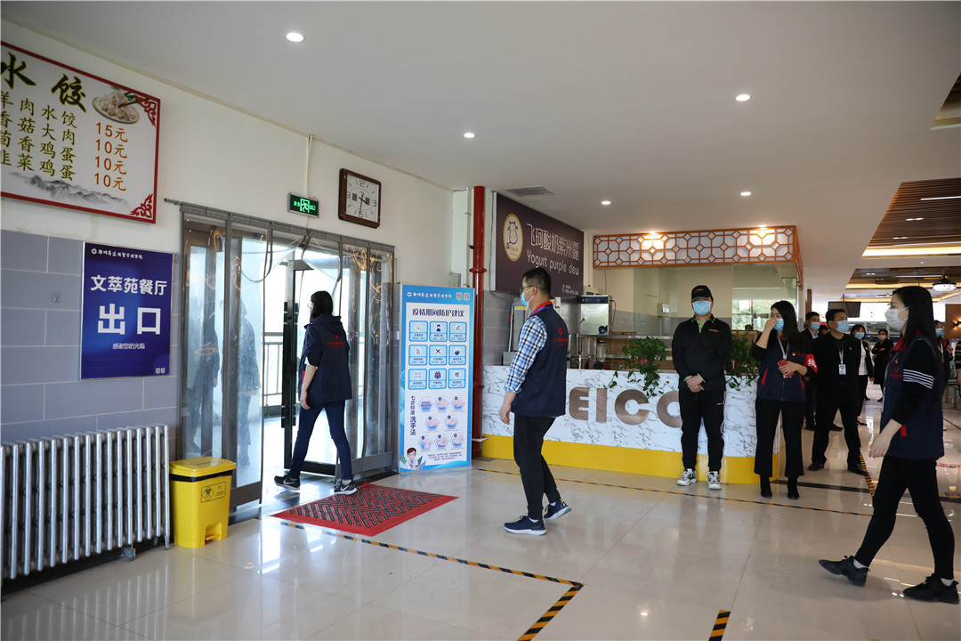 在餐厅就餐的“同学”按照座位上的标识指示就坐,单人单桌,同向就餐。餐厅内的工作人员和志愿者不断巡视,提醒“学生”按照规定要求购餐就餐。餐厅每日对地面、桌椅等进行消杀,确保就餐安全。